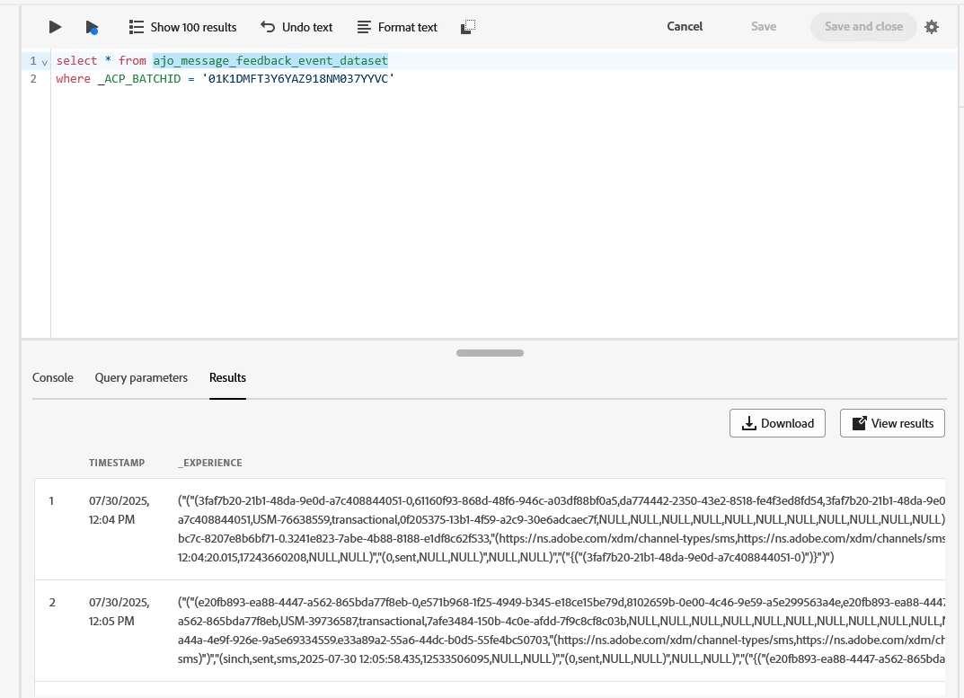 Fetching all rows that matches with batchID of _experience column from "ajo_message_feedback_event_dataset"
