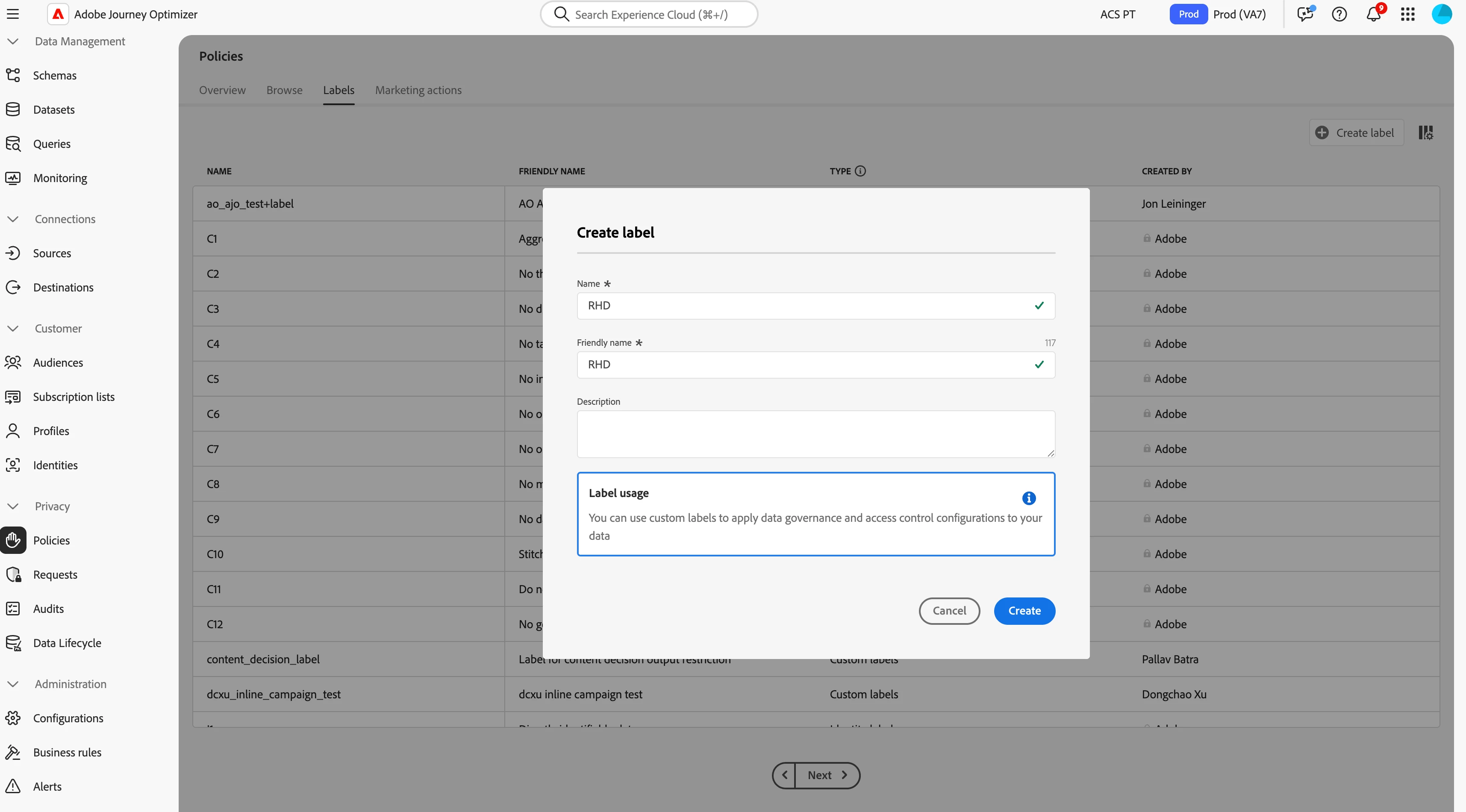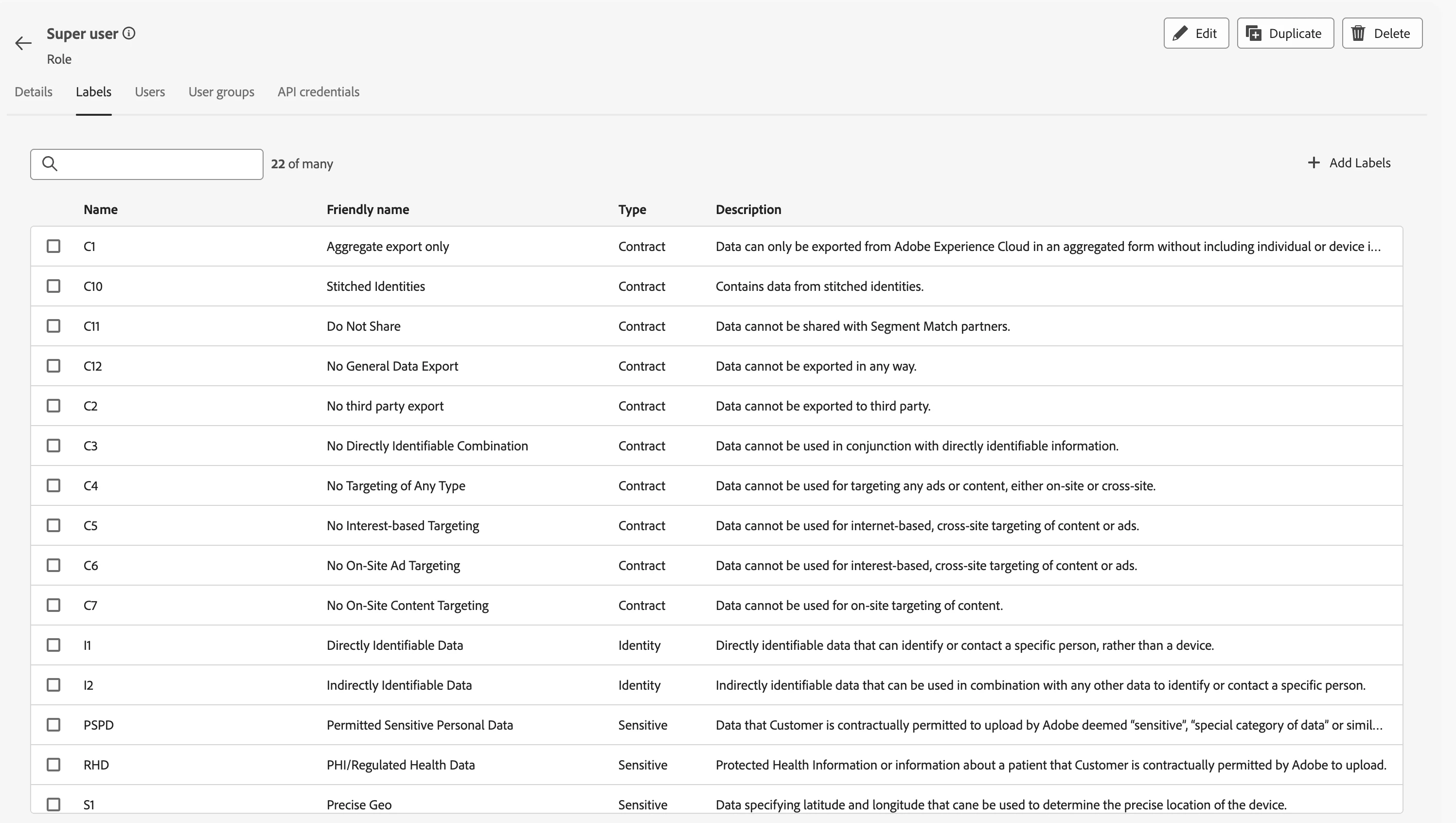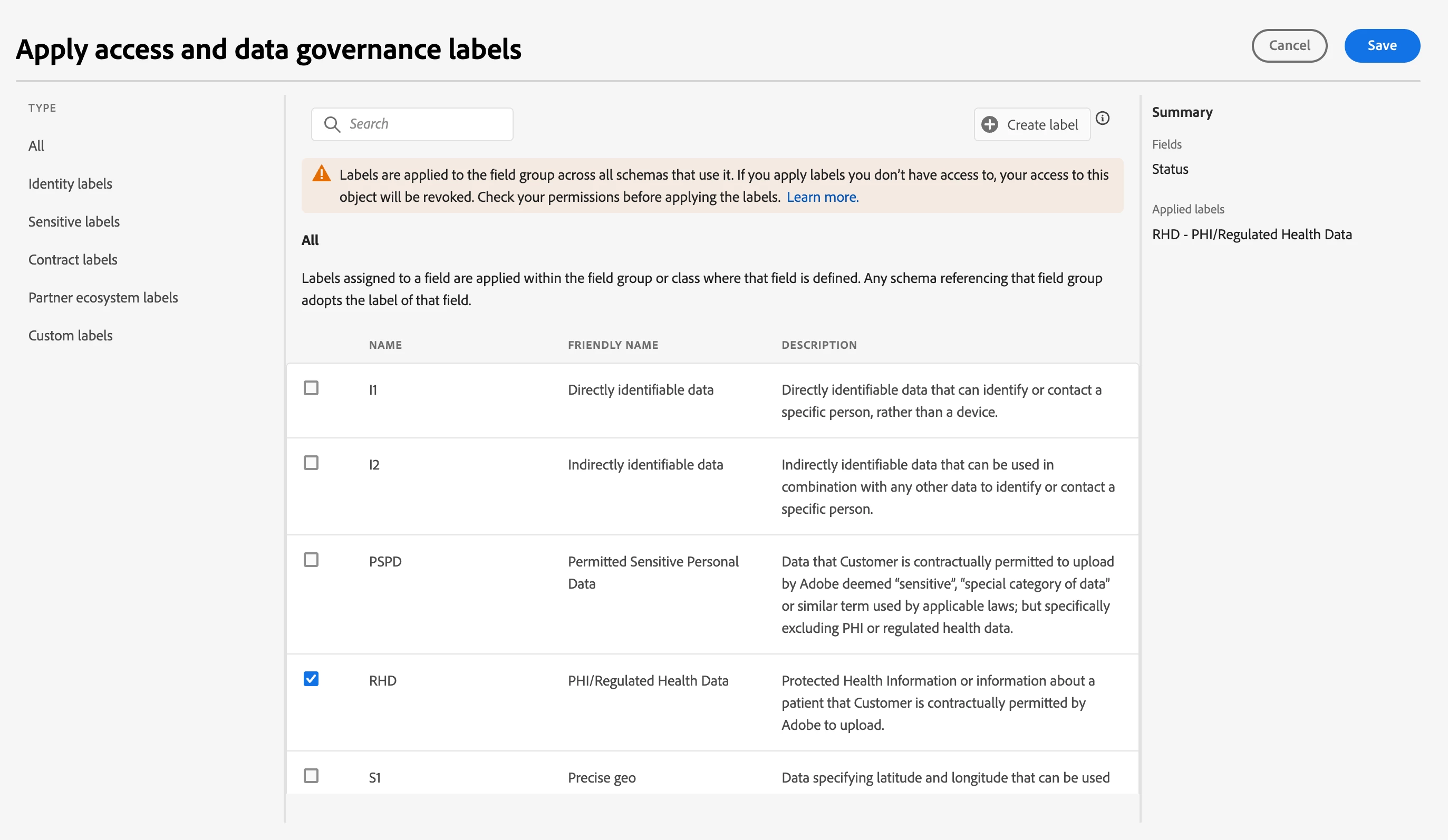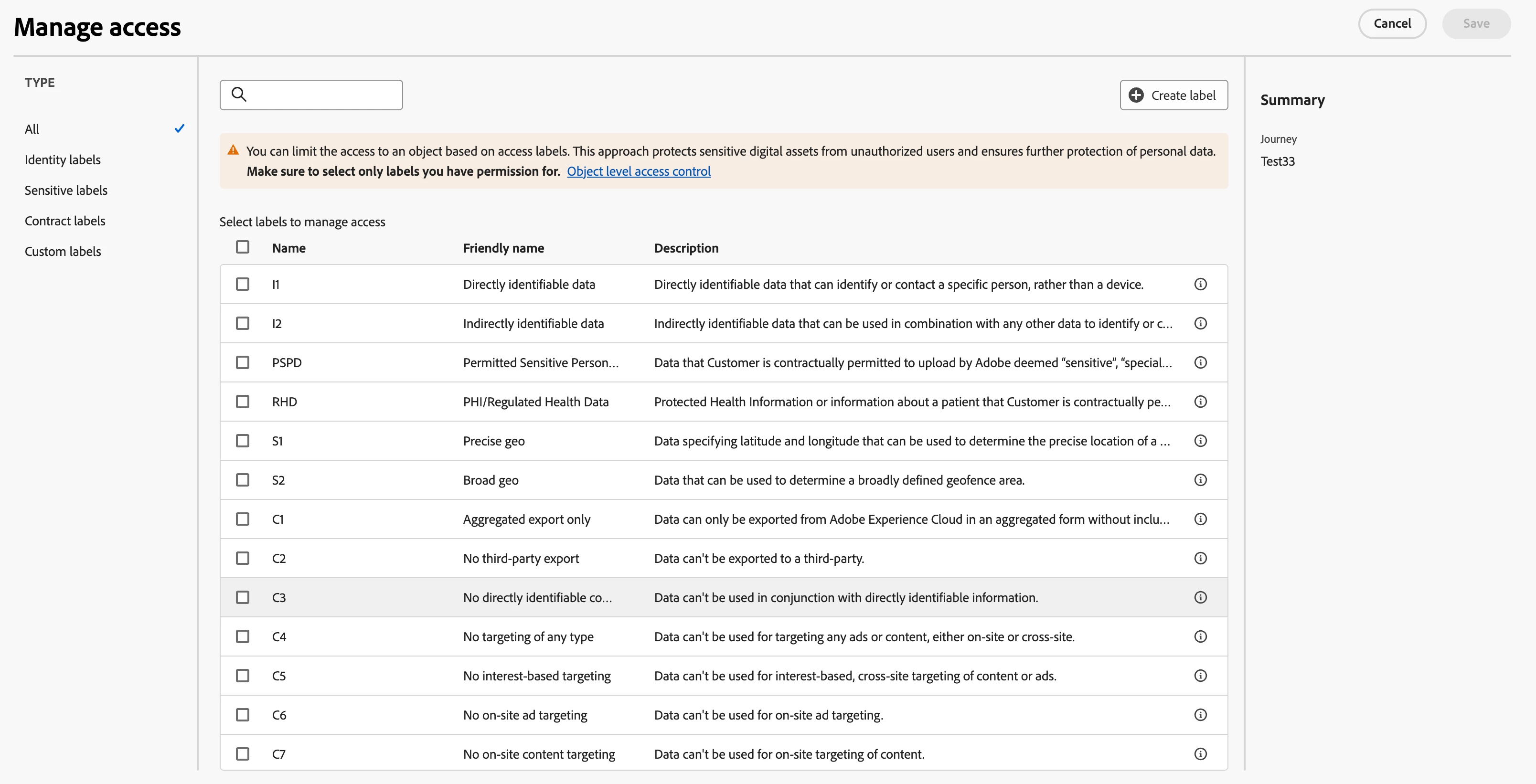 - Assign access labels to objects like journeys, segments, datasets, or schema fields (e.g., "Region: Northeast", "Team: Clinical").
