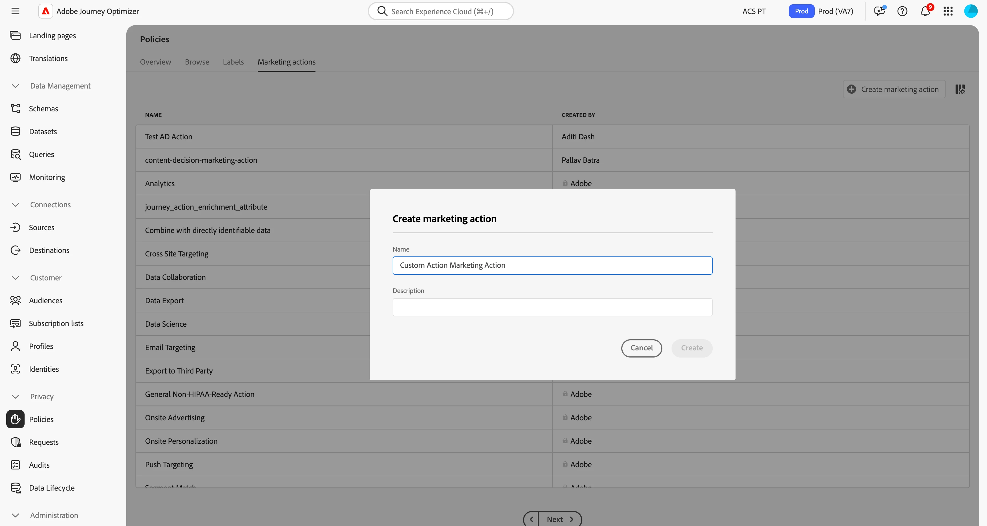 Create Marketing action - Privacy > Policies > Marketing action> Create marketing action