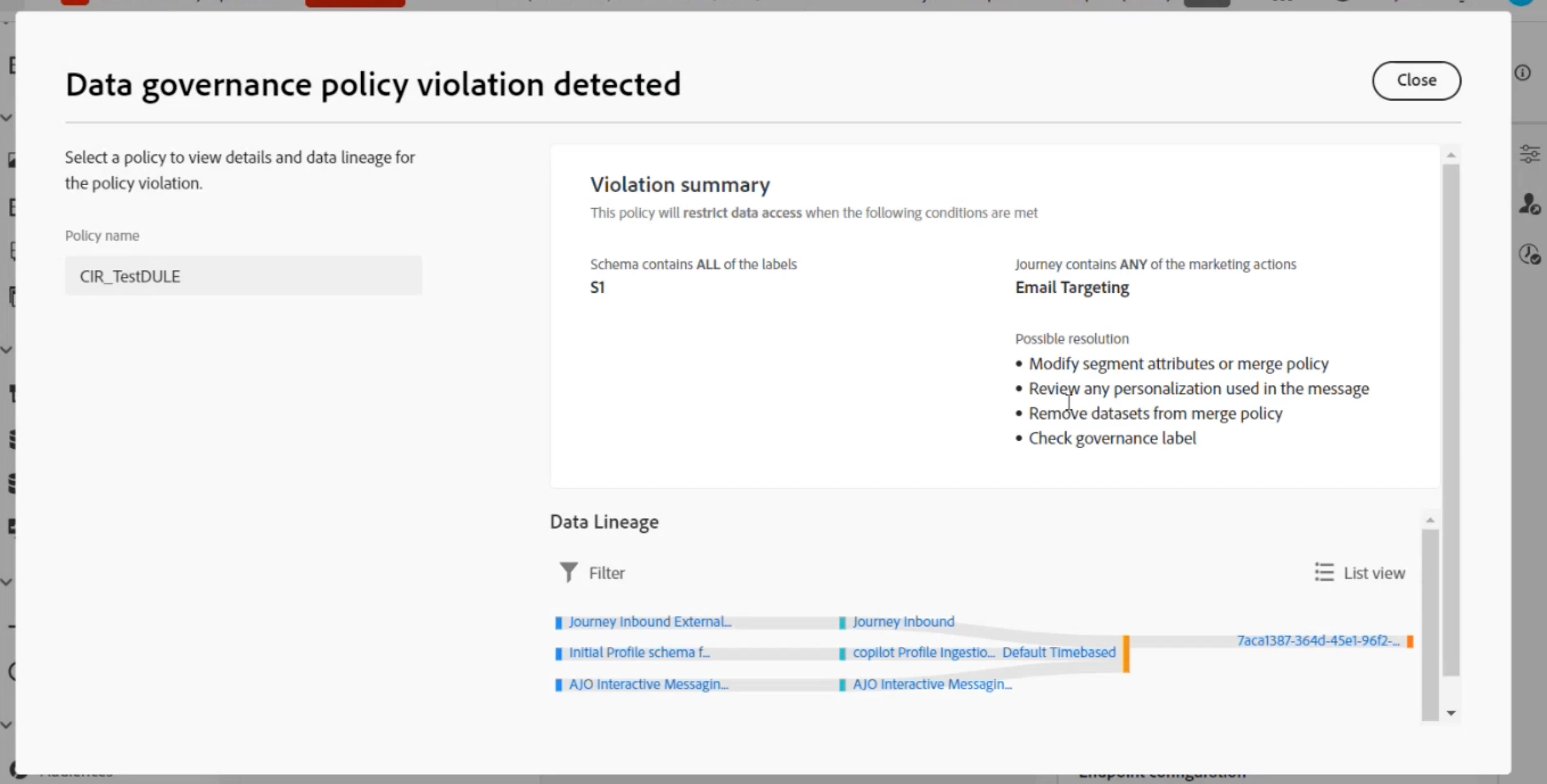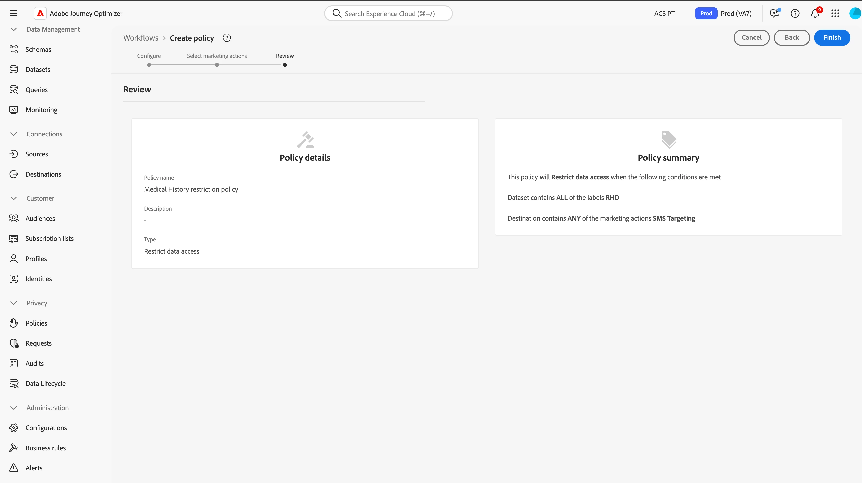 After setting up labels and marketing actions, you can create data governance policies that connect these components. For instance, you might establish a policy linking an “ePHI” label to an “email targeting” action, preventing fields marked as “ePHI” from being used in email personalization.