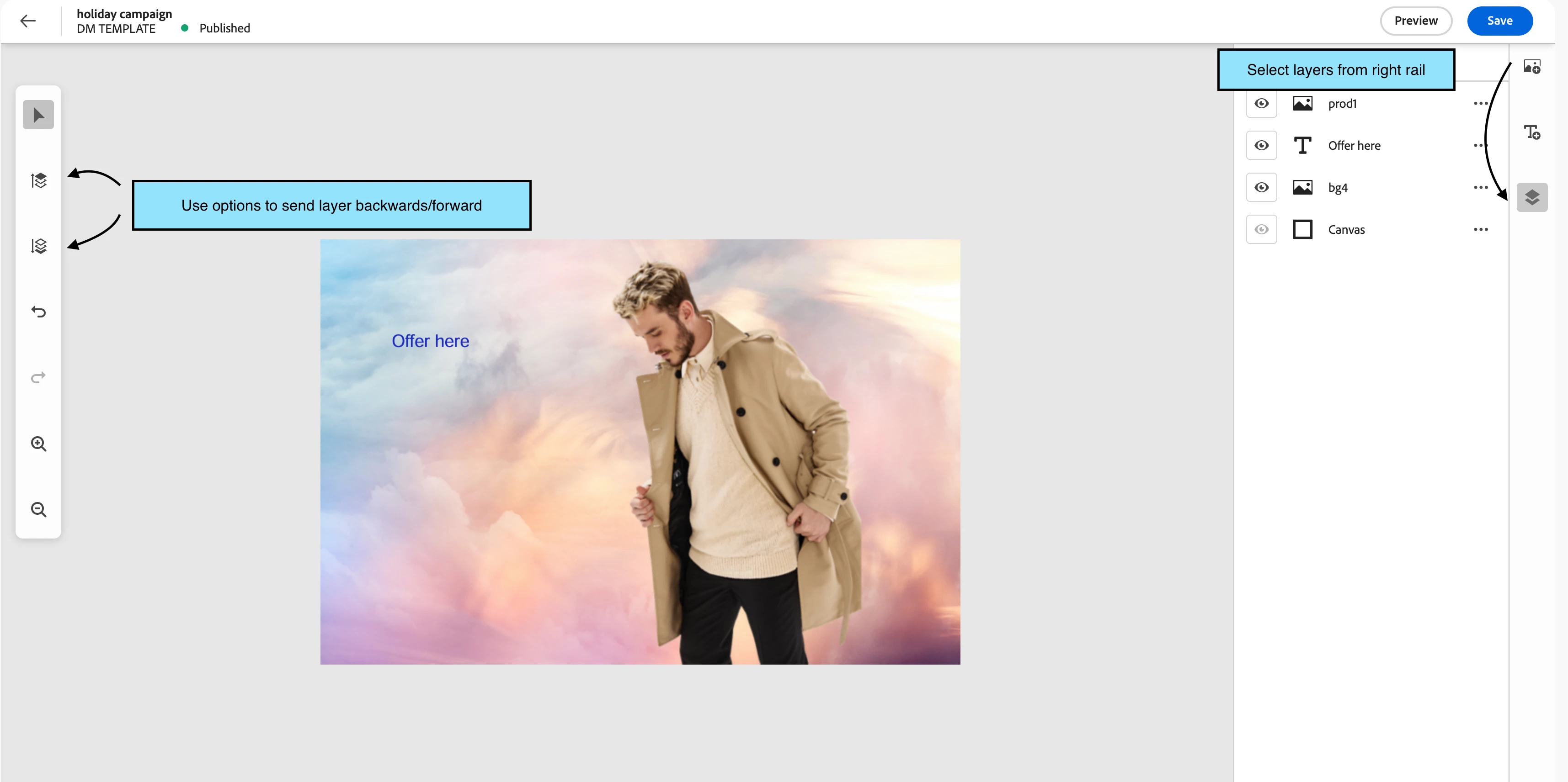 Instead of creating hundreds of individual assets, retailers can create a master template in AEM Dynamic Media. The base promotional banner template with defined layers would have