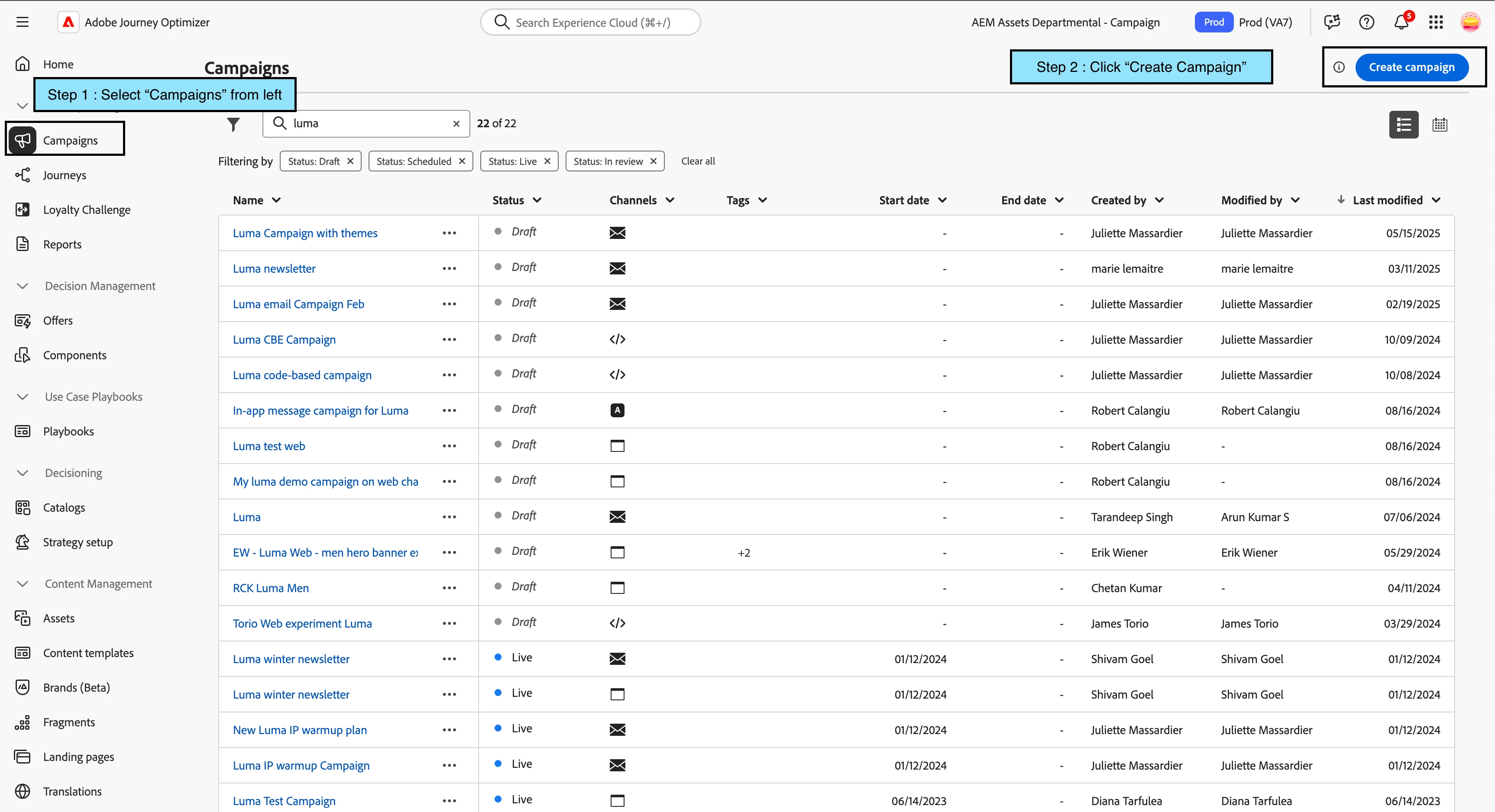 - Select "Campaigns" under "Journey Management" section from AJO left navigation. Create Campaign