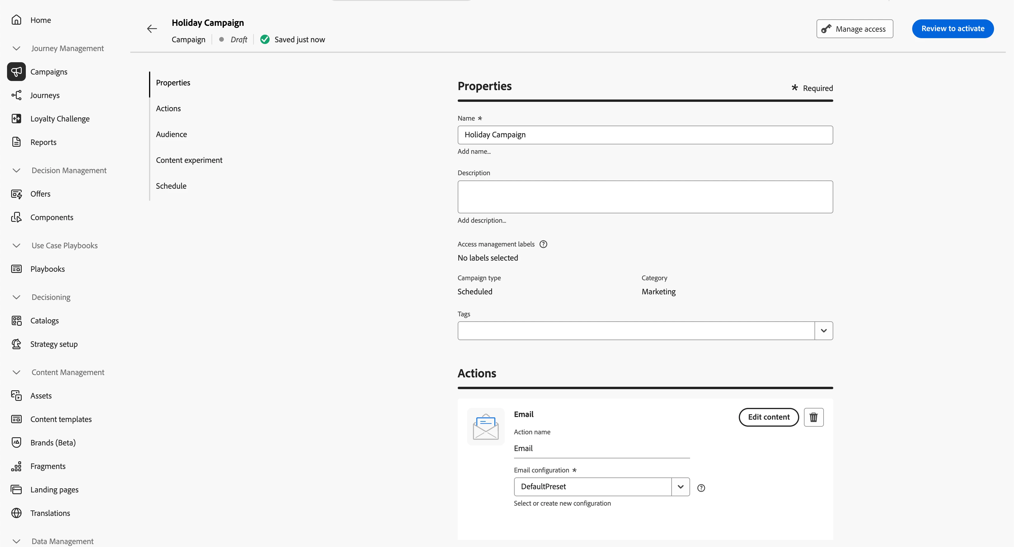 - Enter campaign name. Select "Email" action and select "Email configuration". Click on "Edit Content".