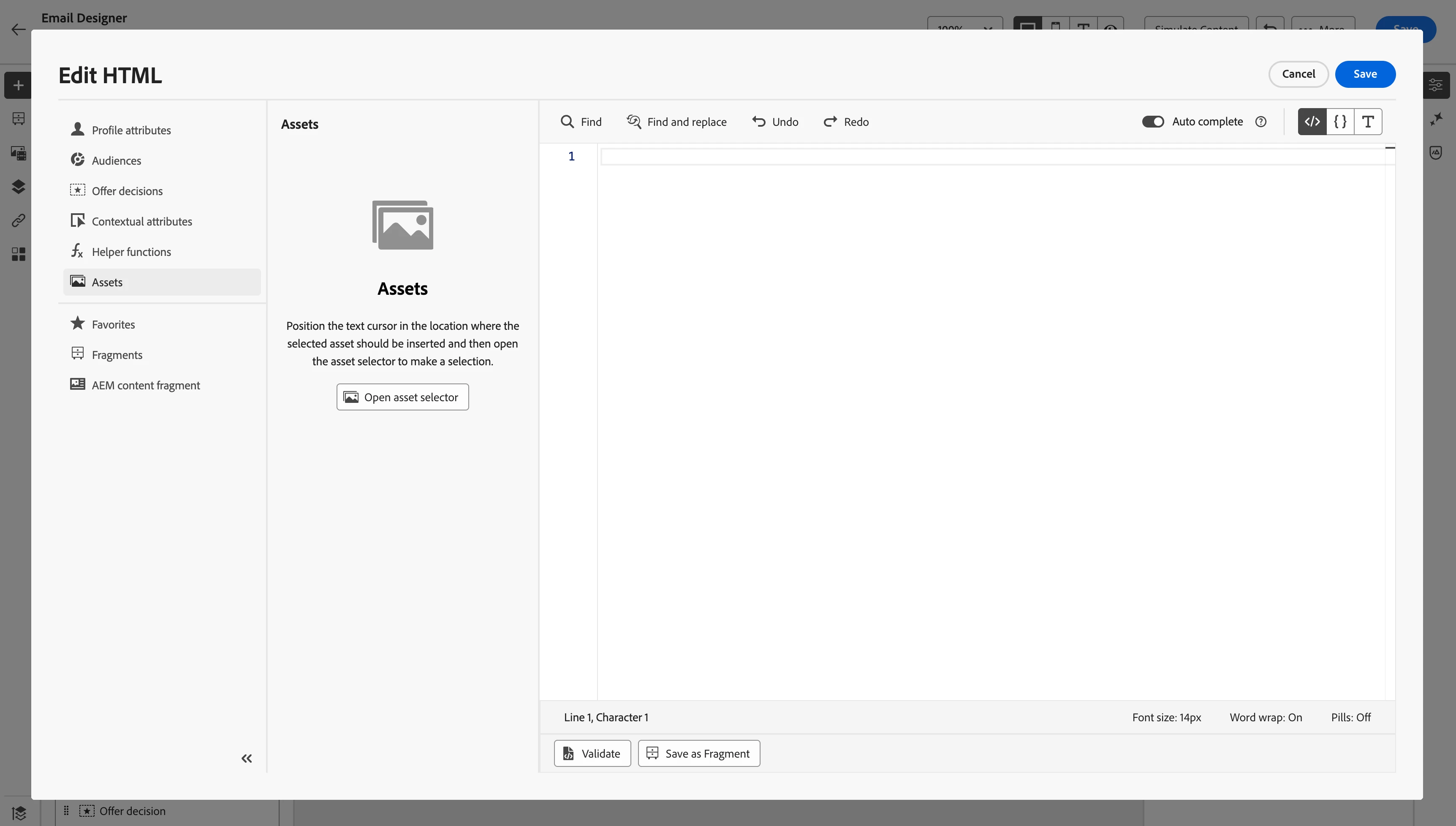- Click on "Assets" option from left rail options. Click on "Open asset selector" button.