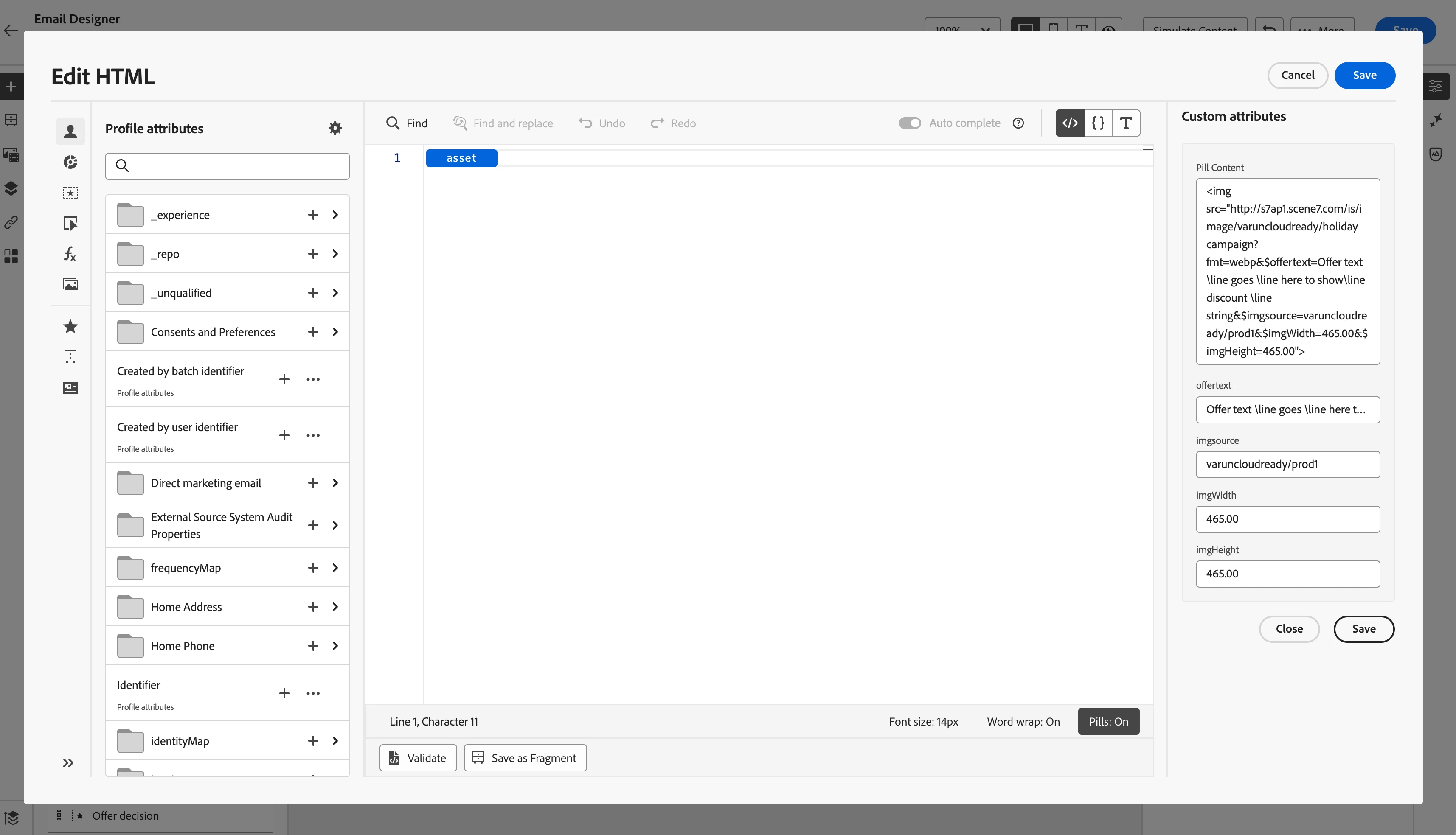 - Apply "DM Template" filter under "MIME Type" section from the filters from left rail of "Asset Selector". Select the Dynamic template from the list and click save.If the "pills" feature is enabled, an asset will be inserted into the code editor as a pill. The user can click on this pill to open the right rail, which displays the asset details and provides options to modify the URL and configure dynamic parameter values for the asset.