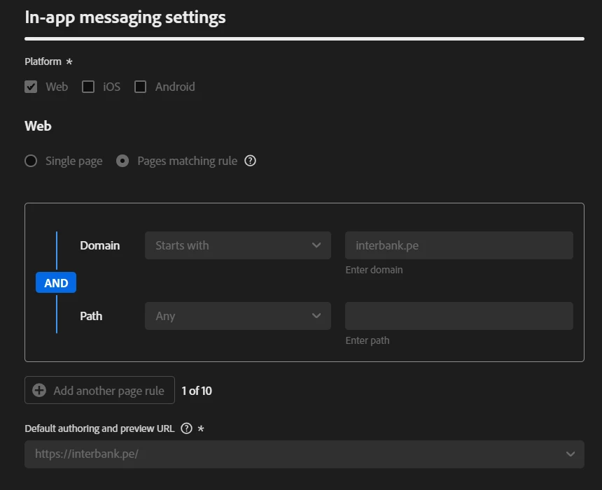 Does anyone know how to configure the In-app Web channel for a specific web page? Currently I have it configured for the URL https://interbank.pe and all its corresponding path. But when I try to place the In-app on the URL https://interbank.pe/tarjetas/tarjetas-credito but it is not printing, I don't know if maybe in the channel configuration would be missing something?