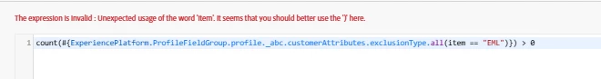 #{ExperiencePlatform.ProfileFieldGroup.profile._abc.customerAttributes.exclusionType} == ['EML']