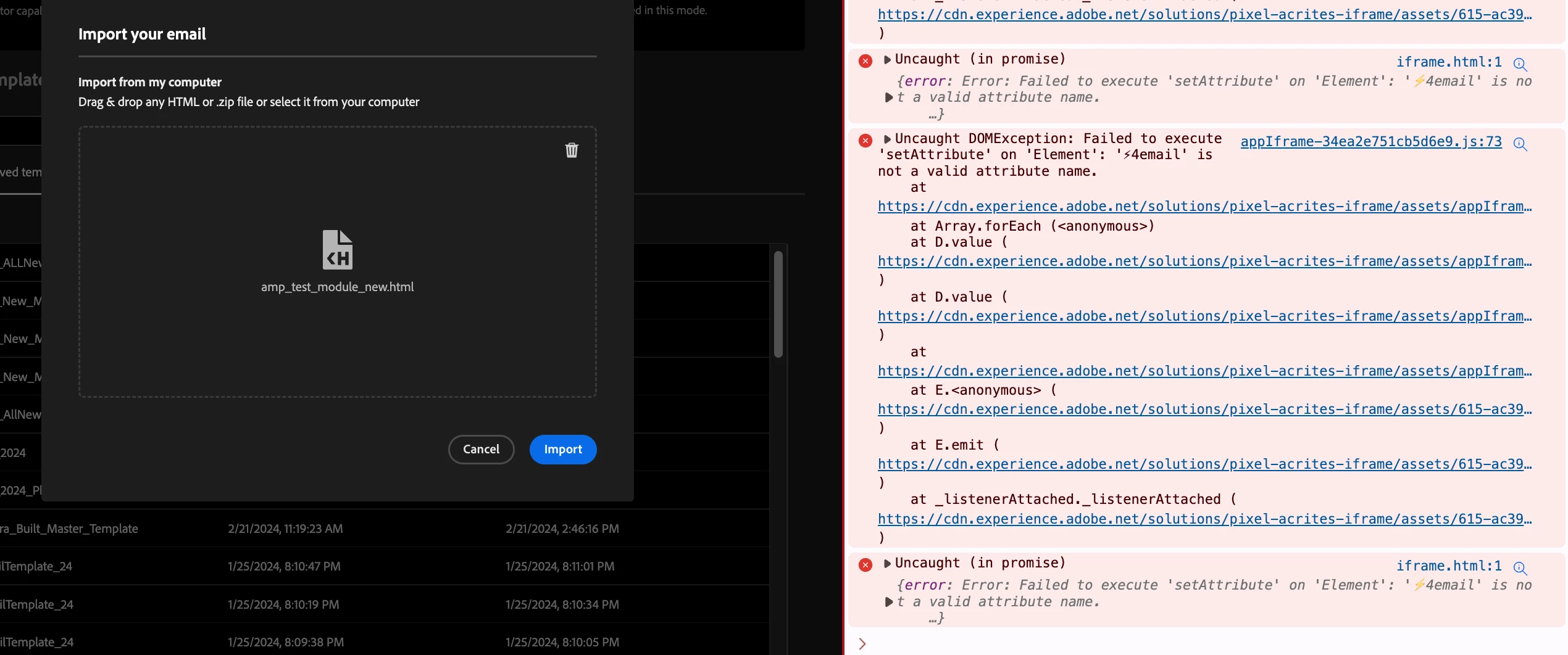 "{error: Error: Failed to execute 'setAttribute' on 'Element': '⚡4email' is not a valid attribute name." in the Console.