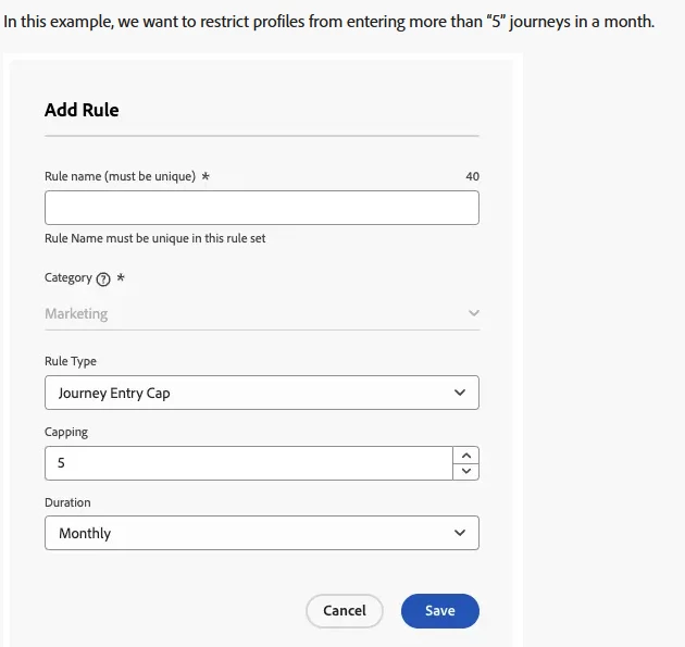 In this example, we want to restrict profiles from entering more than “5” journeys in a month.
