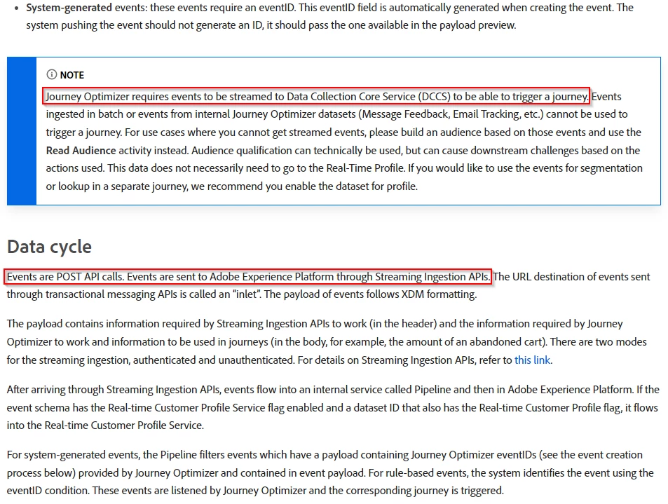 Events are more real-time for example if I want to send order confirmation as soon as the event condition (ex. commerce.checkout) matches it will trigger the journey and you will be able to send the message. Take a look at this documentation