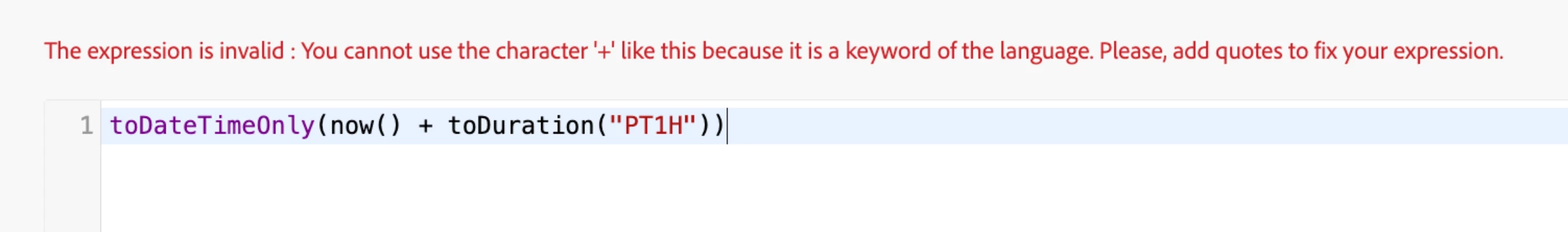 Error message: “The expression is invalid: You cannot use the character '+' like this because it is a keyword of the language. Please, add quotes to fix your expression.”