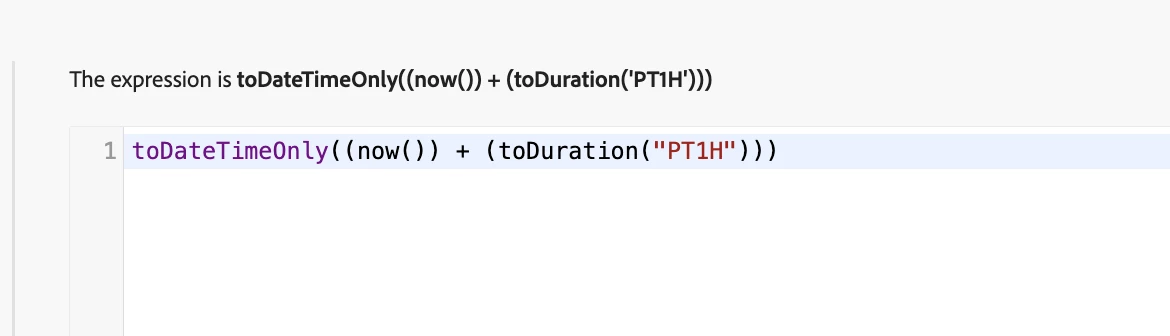toDateTimeOnly((now()) + (toDuration("PT1H")))toDateTimeOnly((now()) - (toDuration("PT1H")))