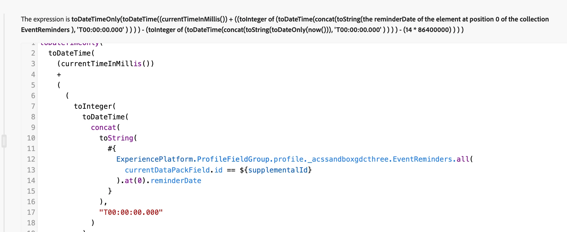#{ExperiencePlatform.ProfileFieldGroup.profile._dcthree.EventReminders.all(currentDataPackField.id == supplementalId).at(0).reminderDate}