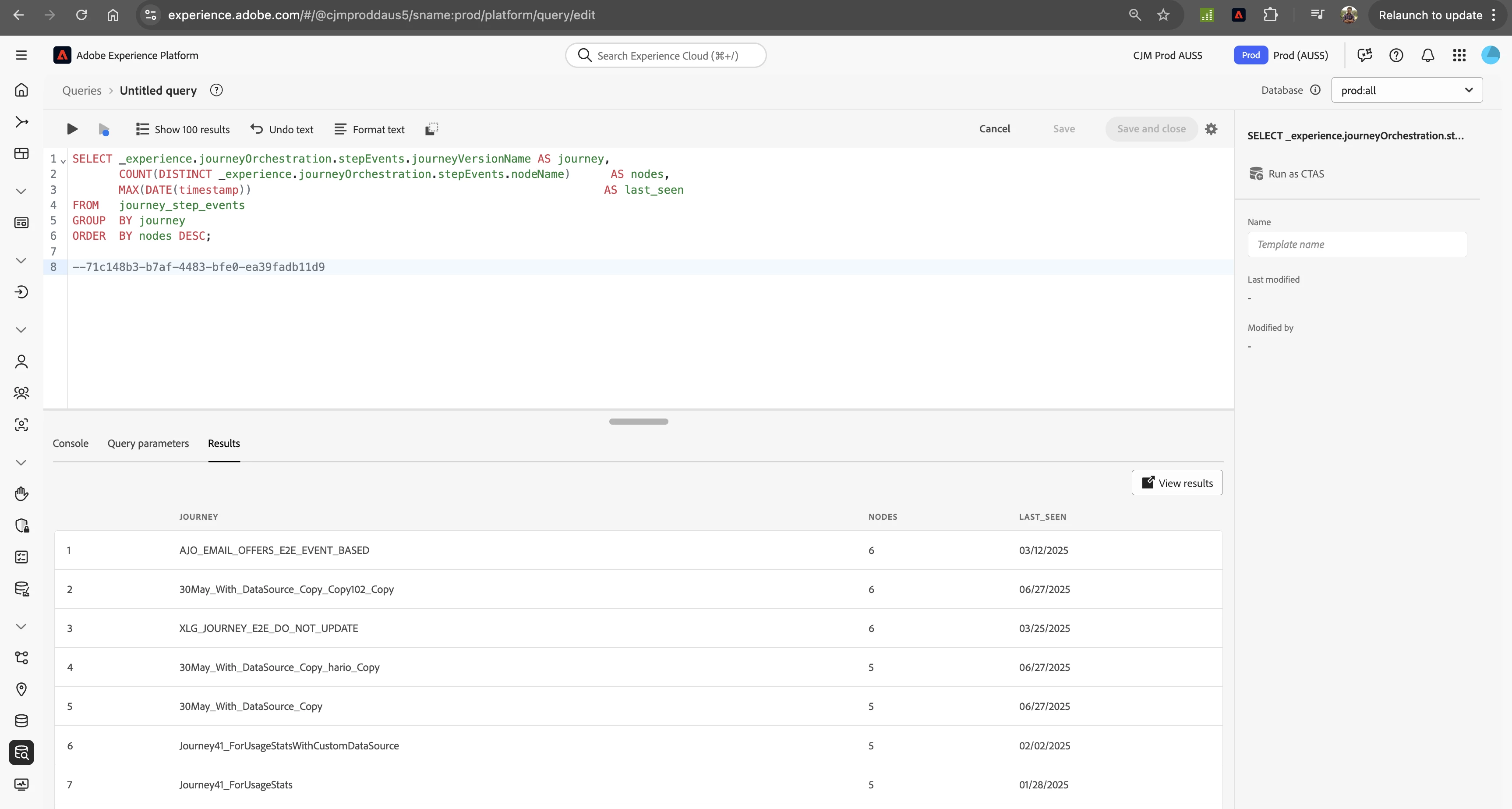 COUNT(DISTINCT _experience.journeyOrchestration.stepEvents.nodeName) AS nodes,