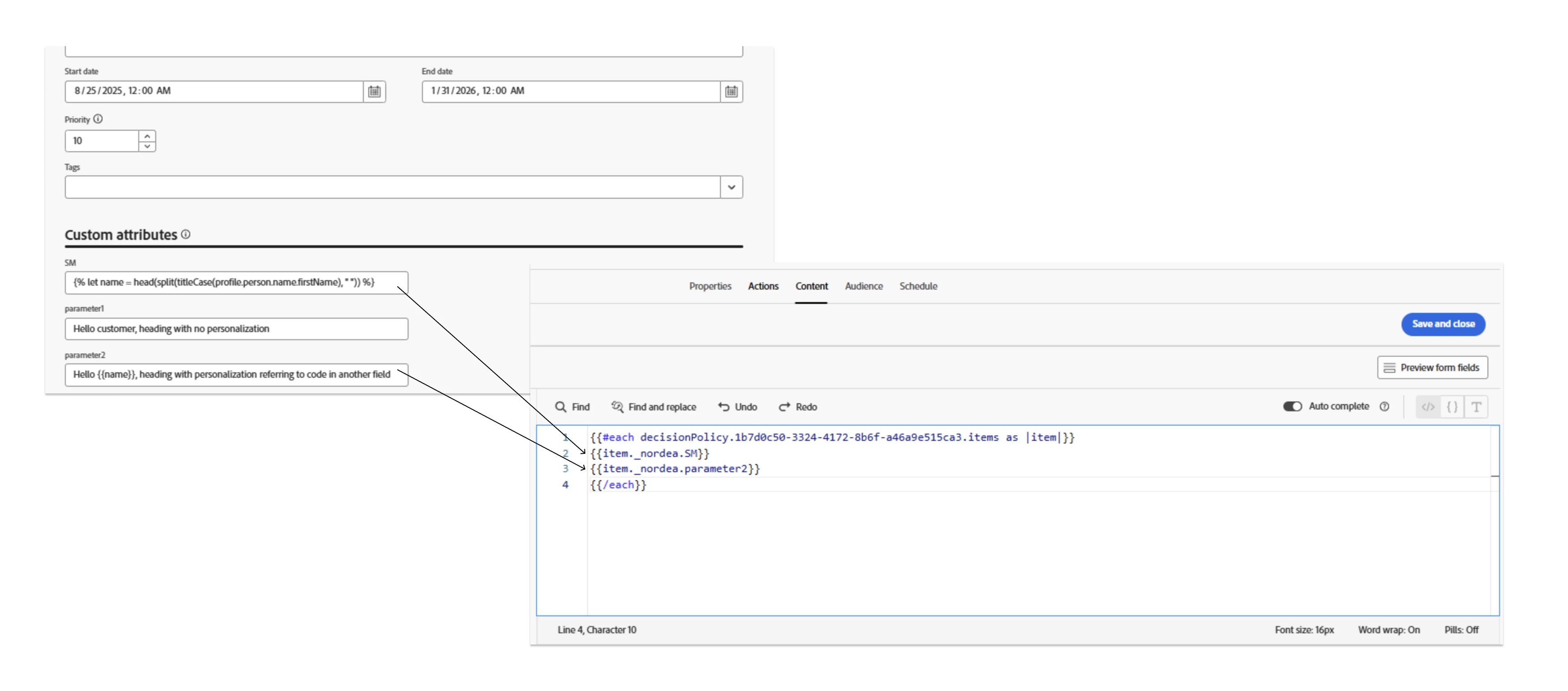 Description - Add personalization (direct profile attributes and PQL functions) support to Offer custom attributes to be able to pull content from the attributes inside decision policy used in code-based channel.