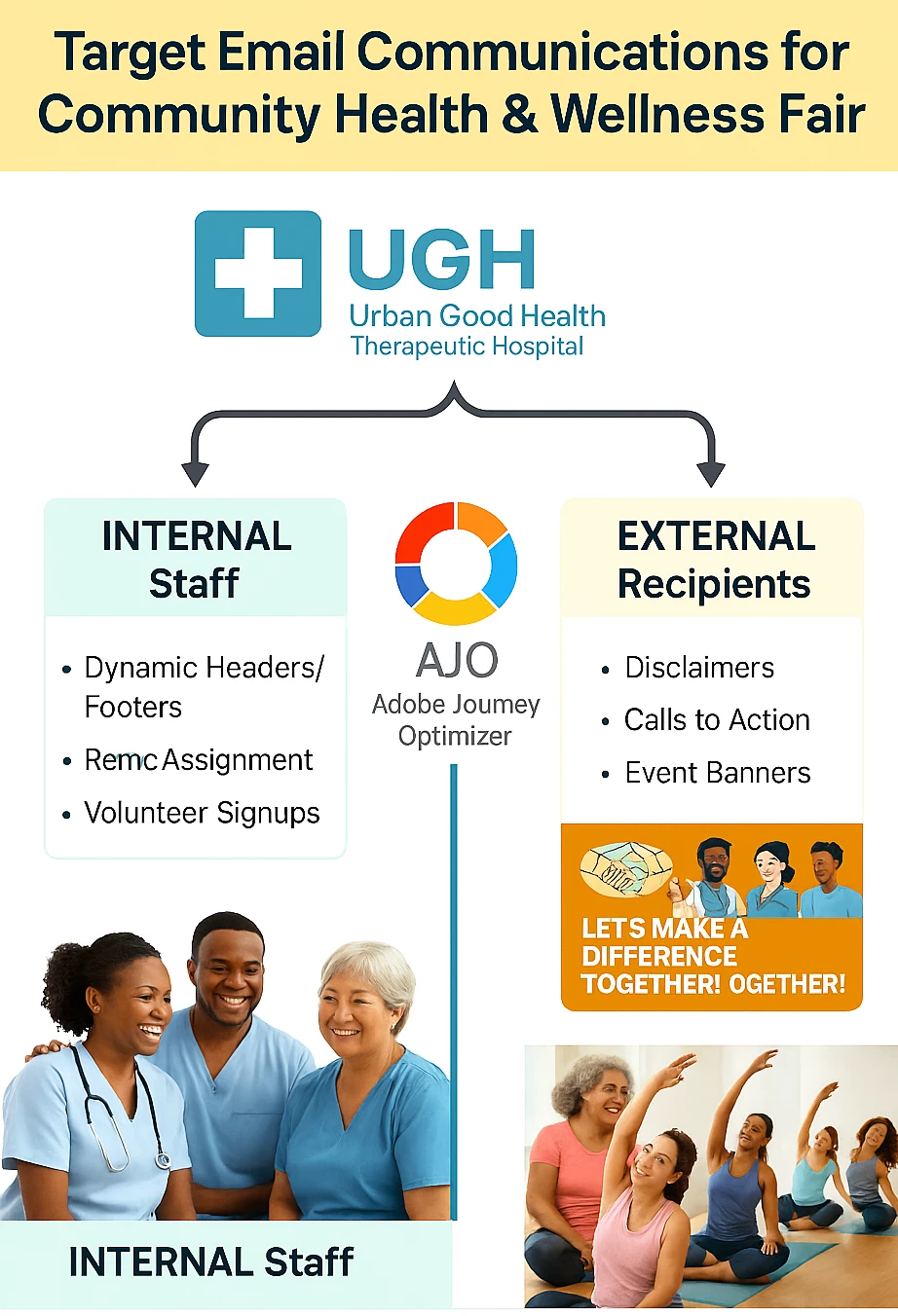 For the upcoming Community Health & Wellness Fair, UGH hospital needs to deliver targeted email communications through Adobe Journey Optimizer (AJO) for both internal staff and external community members at the same time. Internal employees require emails with dynamic header, footer, or informational blocks specific to their roles (such as booth assignments, volunteer sign-up links, and facilitation reminders), while external recipients (local residents, past patients, and partner organizations) need invitations, event details, and registration calls to action—all potentially with distinct disclaimers or event-specific banners.