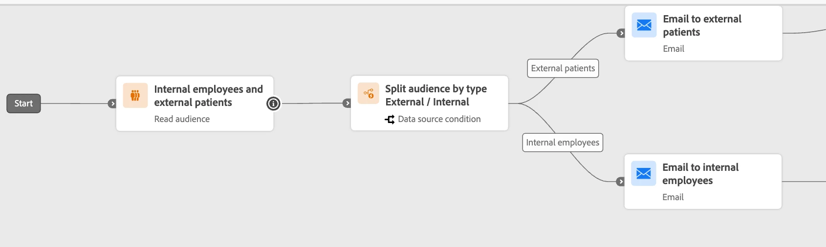 Orchestrate the journey to set the correct context or choose the right template for internal vs. external recipients.