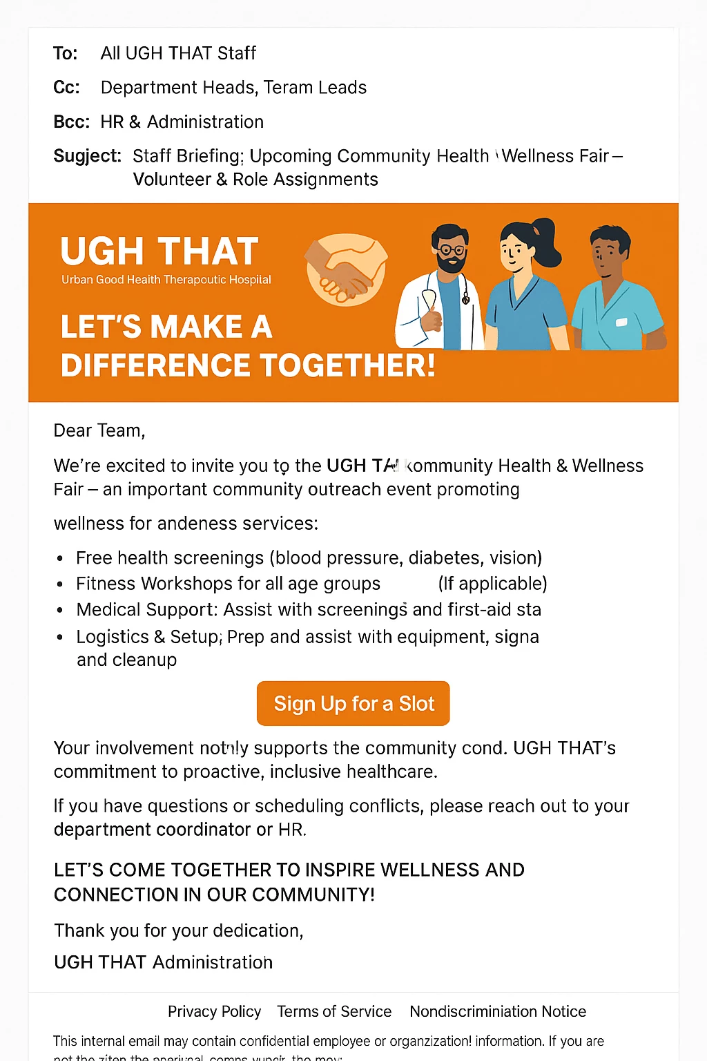 Provide customized instructions based on the internal recipient’s role, such as reminders for facilitators and sign-up info for volunteers. This ensures each staff member receives clarity on their duties or event logistics according to their assignment.
