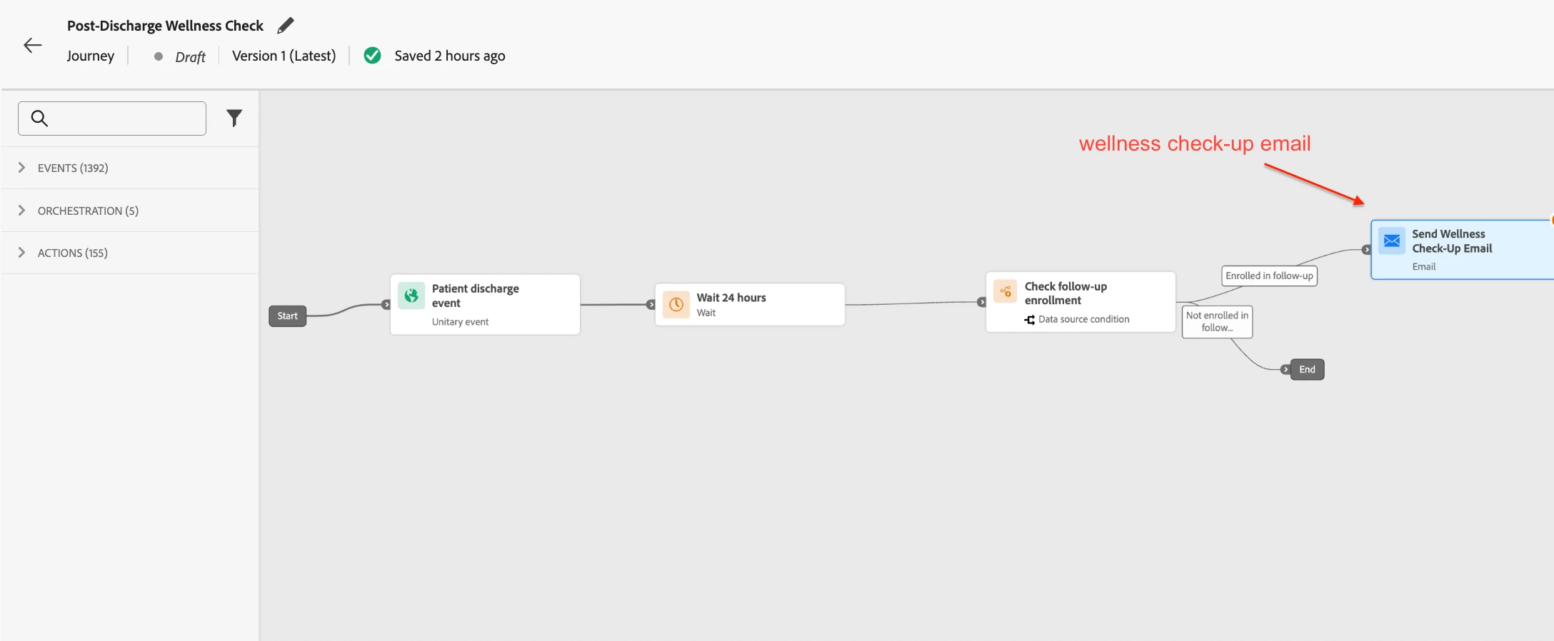 Post-discharge follow-ups — a multi-step journey with wellness content and check-in surveys sent over 14 days after hospital discharge