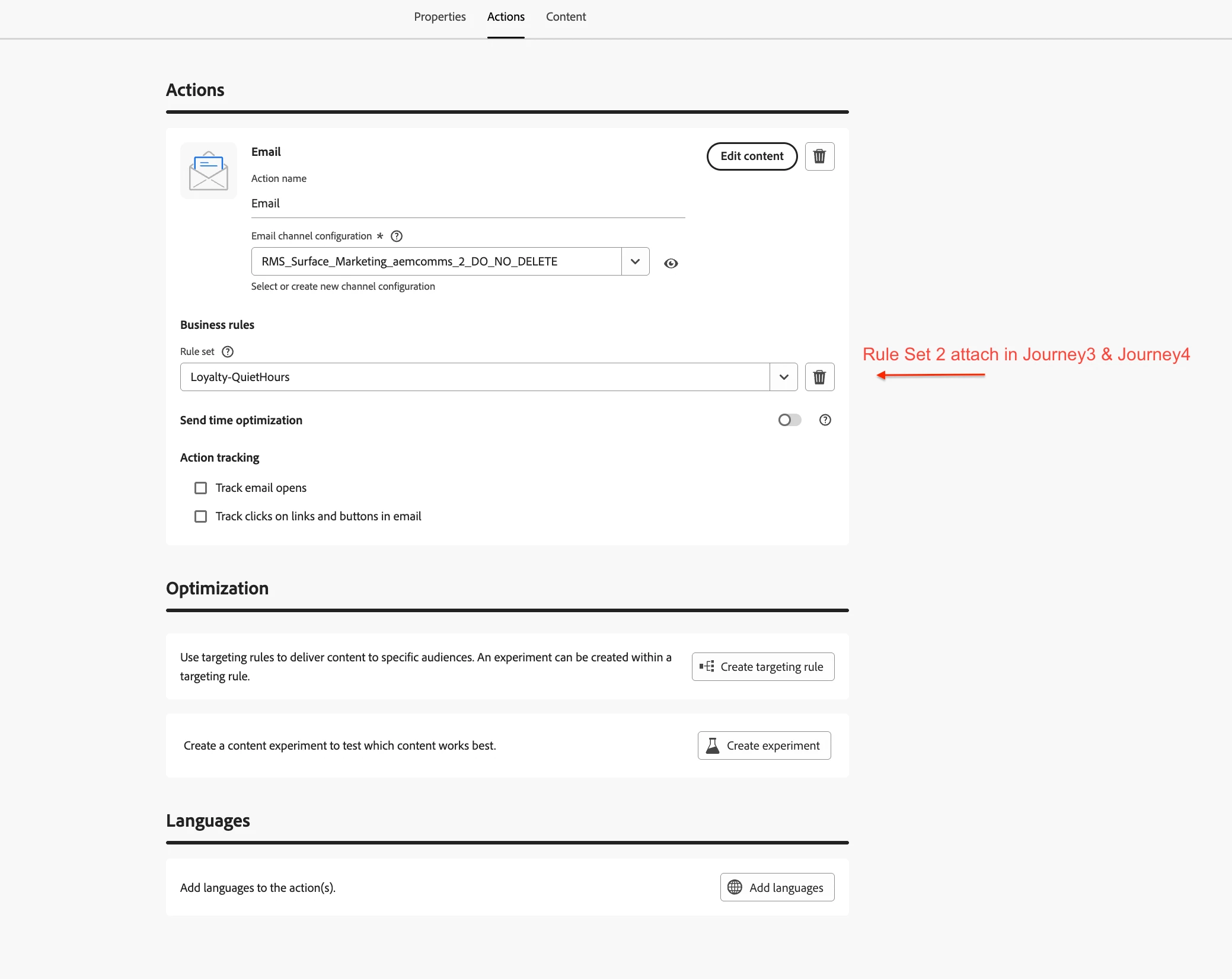 Once the ruleset is active, we attach the rule set to the SMS, push, and email actions across all three journeys. Here is how the journeys look in the AJO UI.
