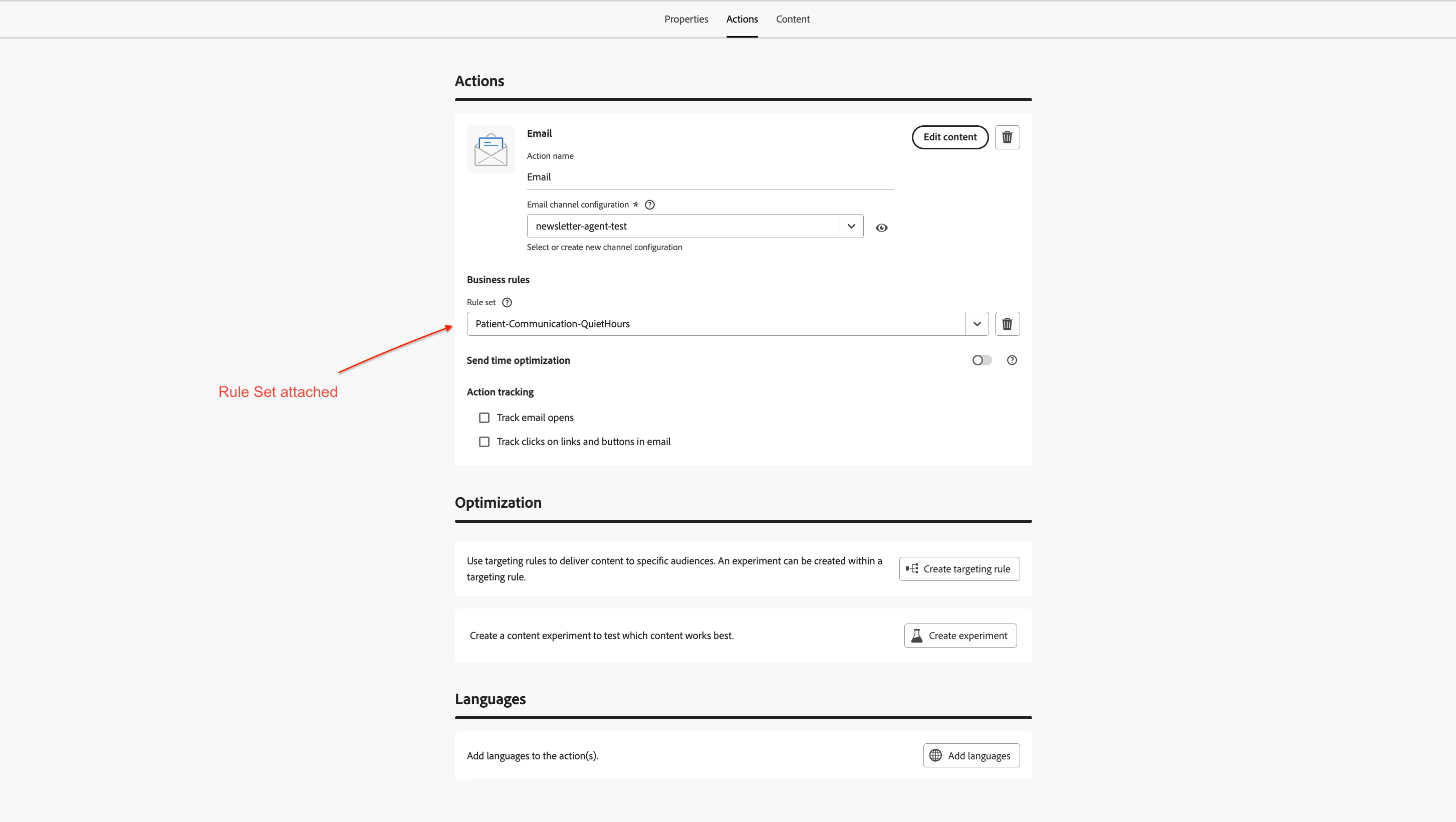 Rules are configured through custom channel rule sets and applied to individual journey actions
