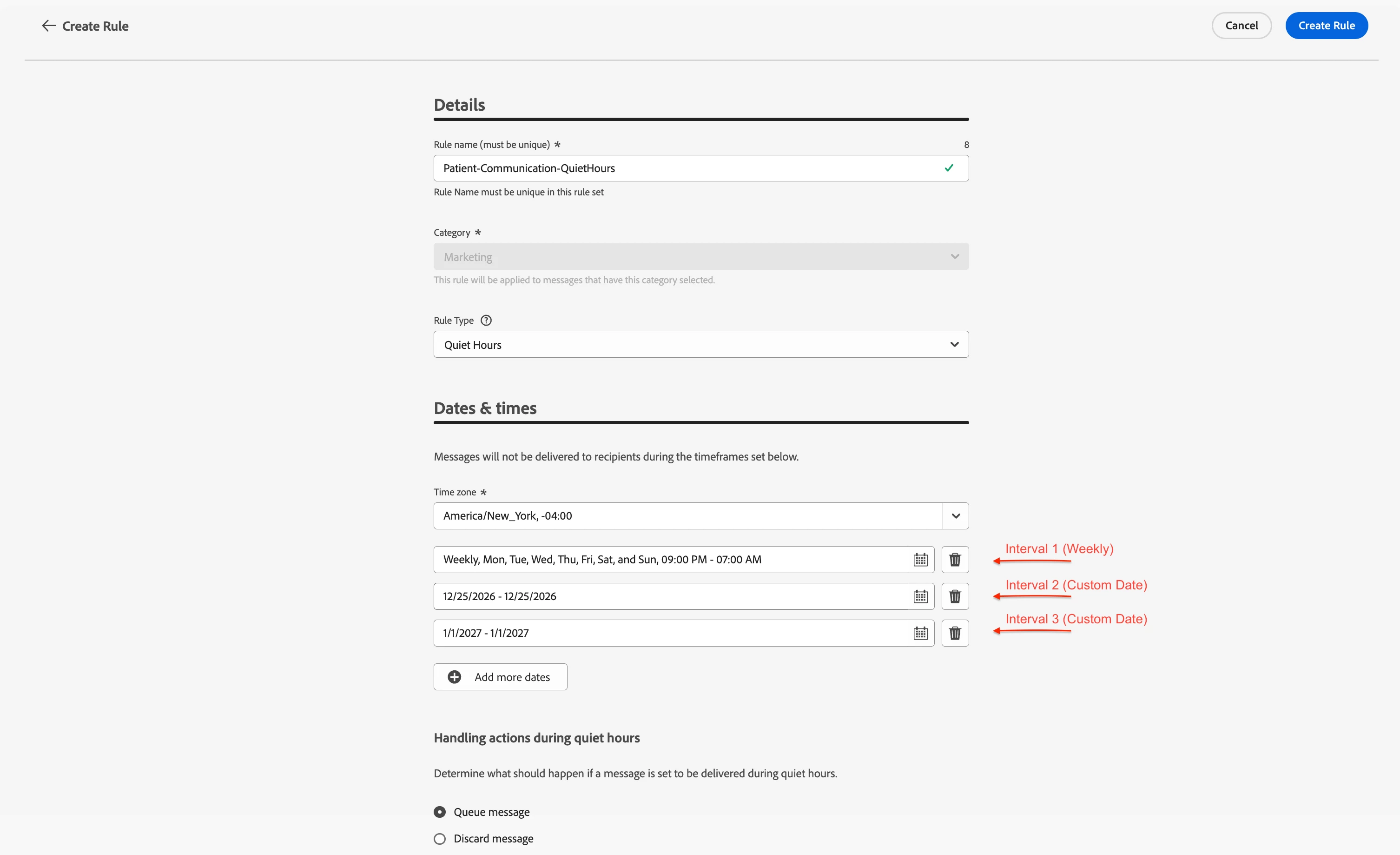 We will create a single rule set called Patient-Communication-QuietHours containing one quiet hours rule with two intervals: