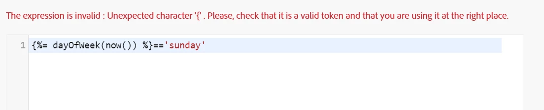How can I retrieve the day of the week using the AJO Advanced Expression Editor? I'm encountering the following error when using the syntax {%= dayOfWeek(now()) %}.