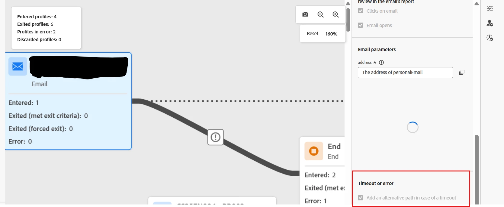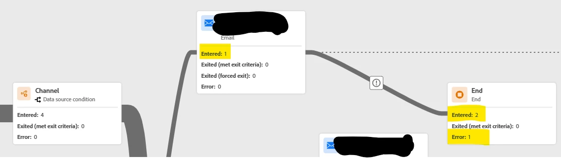 Also, since the alternative path is enabled, the email action itself does not show any error count, and instead, the profile continues via the alternate path. The End node then shows Error: 1.