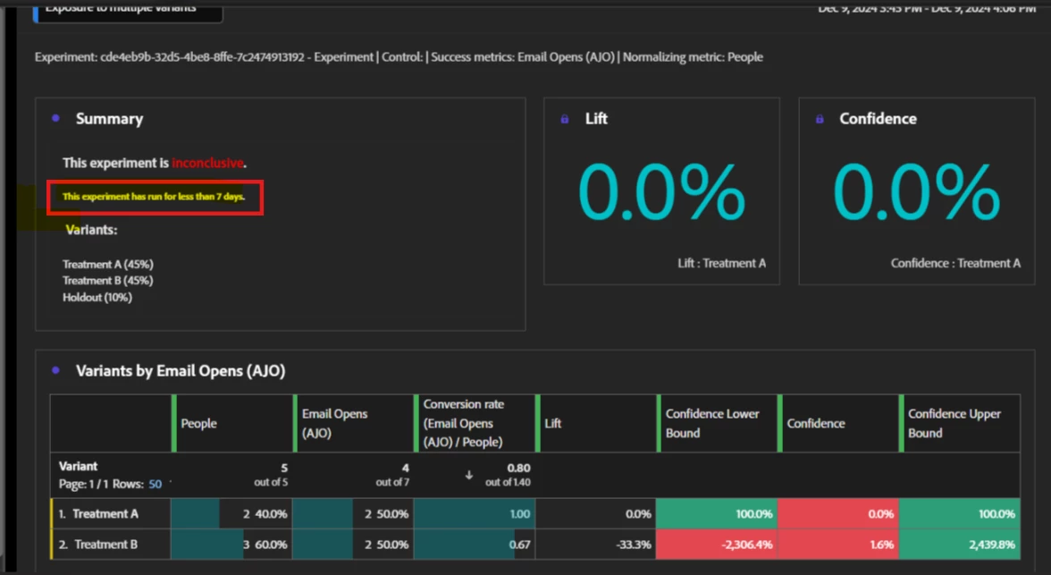 I am running an A/B test with 100 audience members, where 10% (10 people) are assigned to Treatment A, 10% (10 people) are assigned to Treatment B, and the remaining 80% (80 people) are in the holdout group. You're using open rate as your metric to compare the effectiveness of Treatment A and Treatment B. After determining which treatment has the best open rate, you'd like to automatically send the remaining 80% of emails to the winning treatment group.