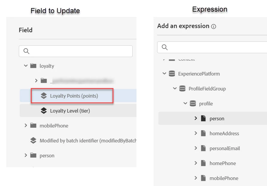 In the Update Profile action, we select Loyalty Points but that value missing in the Expression dialog prevents us from using the appropriate Math function. Is this because the Update Profile action only updates values under the OOTB Persons Fieldgroup - meaning it can't update any custom values? If not, what could be the issue here?