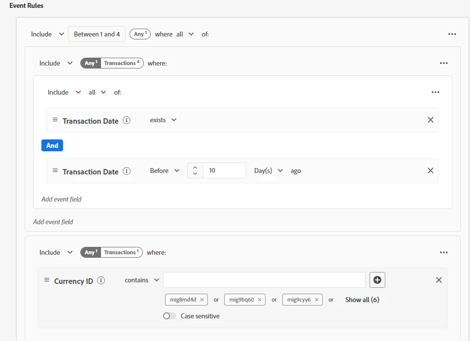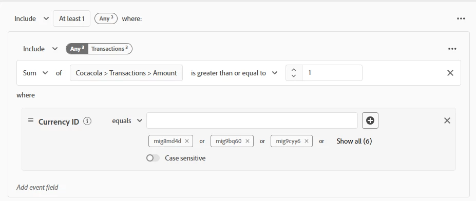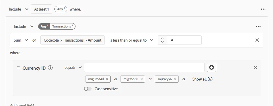The profile can have up to 5 currency ID’s. I’m trying to create an audience that when I sum up the Amount, I only select those where total is <=4.
