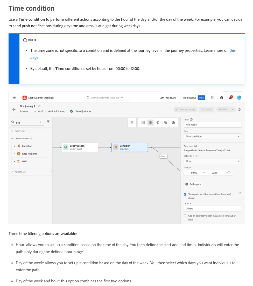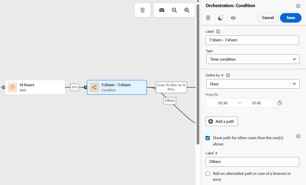 Entry Audience > Wait activity under Orchestration > Condition ... Time condition Type under Orchestration ... Define by Hour ... Start Time: 0730 | End Time: 0745 > send comms.