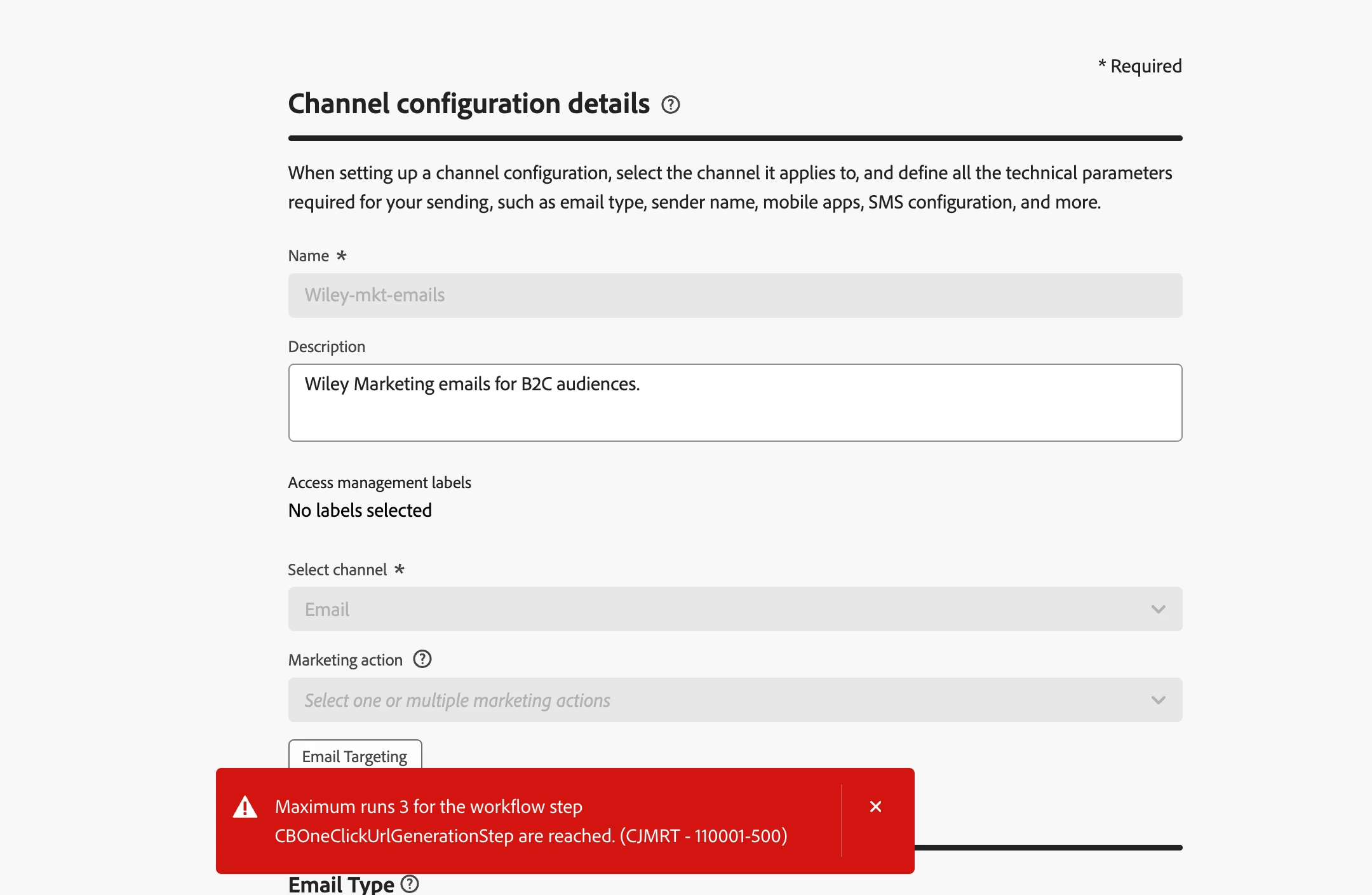 "Maximum runs 3 for the workflow step CBOneClickUrlGenerationStep are reached. (CJMRT - 110001-500)"