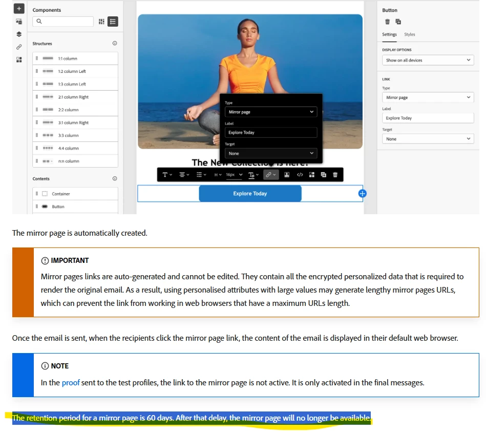 According to the documentation, "The retention period for a mirror page is 60 days. After that delay, the mirror page will no longer be available." However, I conducted a test with an email sent in July 2024, and the mirror page link is still active.