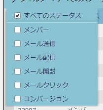 メールプログラム>メンバーと進み、フィルターの項目を見ると「メール送信」や「メール開封」、「コンバージョン」などが存在します。