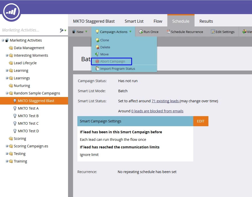 Sometime you may have a campaign that you thought was ready to go, but after it actually get's activated you notice a typo in the email, or there's a problem with one of your flow steps. If you absolutely have to stop a batch campaign that is currently running, you can use the abort button in the Campaign Actions menu. This will stop leads from moving through any more flow steps, but cannot undo those steps that have already been processed, and it cannot un-send any emails that have already been sent.