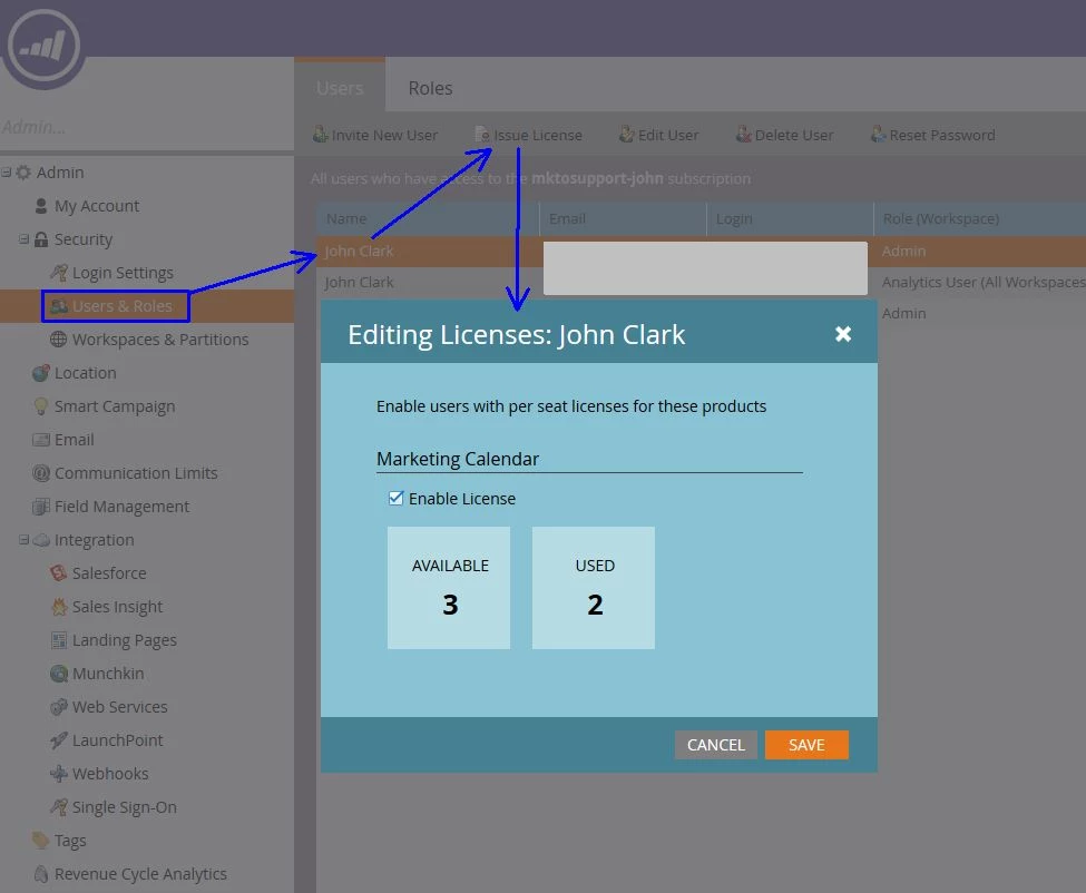 Each instance of Marketo gets 5 licenses for the Calendar, with the option of adding more if you work with your Account Manager. In order to use/view the Calendar, a user must first be issued a license in Admin > Users & Roles. I've included the screenshot below to make it easier to find.