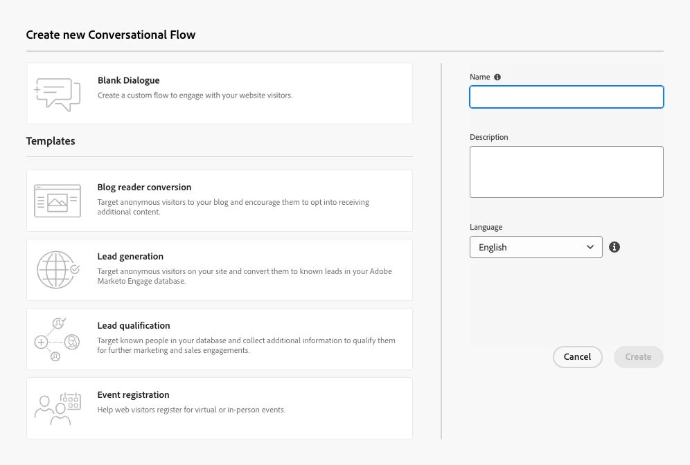 To access these templates from within the application, select either “Create Dialogue” or “Create Conversational Flow” from the “Automated Chat” section on the left navigation panel.