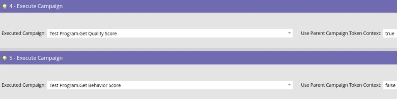 Otherwise, if “Use Parent Campaign Token Context” is set to “False” then all these token values will be taken from the program containing the executable campaign or they will be taken from the executable campaign itself (in which case using trigger tokens will be useless because the executable campaign has no trigger).