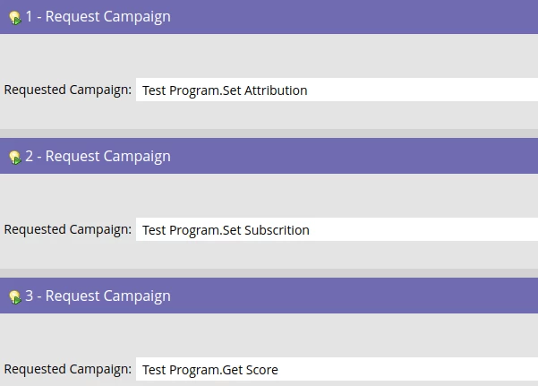 Since the subscription, attribution, and scoring flows do not depend on one another this is a good chance to use Marketo request campaigns because all these flows will complete quicker in parallel than if they were executed sequentially using executable campaigns.