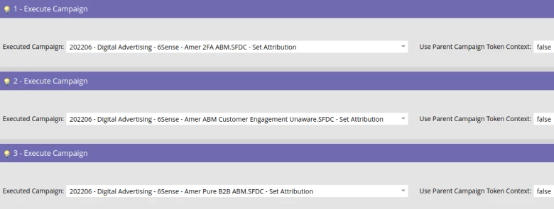 An example of where you would want to set “Use Parent Campaign Token Context” to “True” is if you have 3 contact sales form fill campaigns each in their own program that all request the same executable campaign to MQL a person and populate the applicable MQL fields: