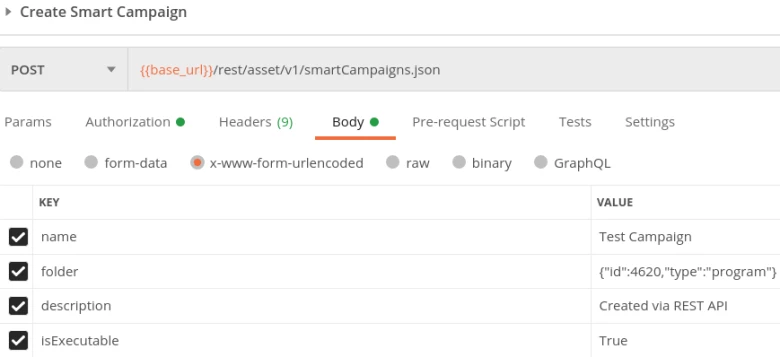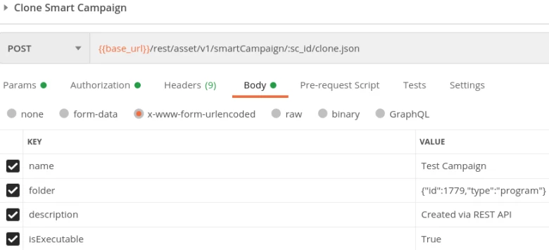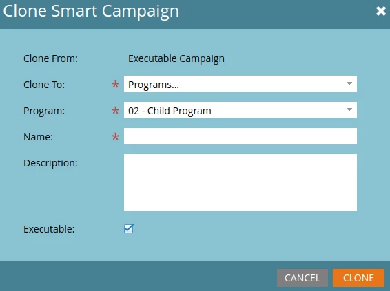 Cloning an executable campaign using the Marketo APIN.B. Whether you are cloning a campaign manually or with the API, cloning a trigger campaign to make it executable will not work. You will have to remove the trigger from the campaign being cloned, essentially creating a batch campaign, or you will have to create a new campaign (making sure to select the “Executable” checkbox) with the same filters in the smart list and the same flow steps.