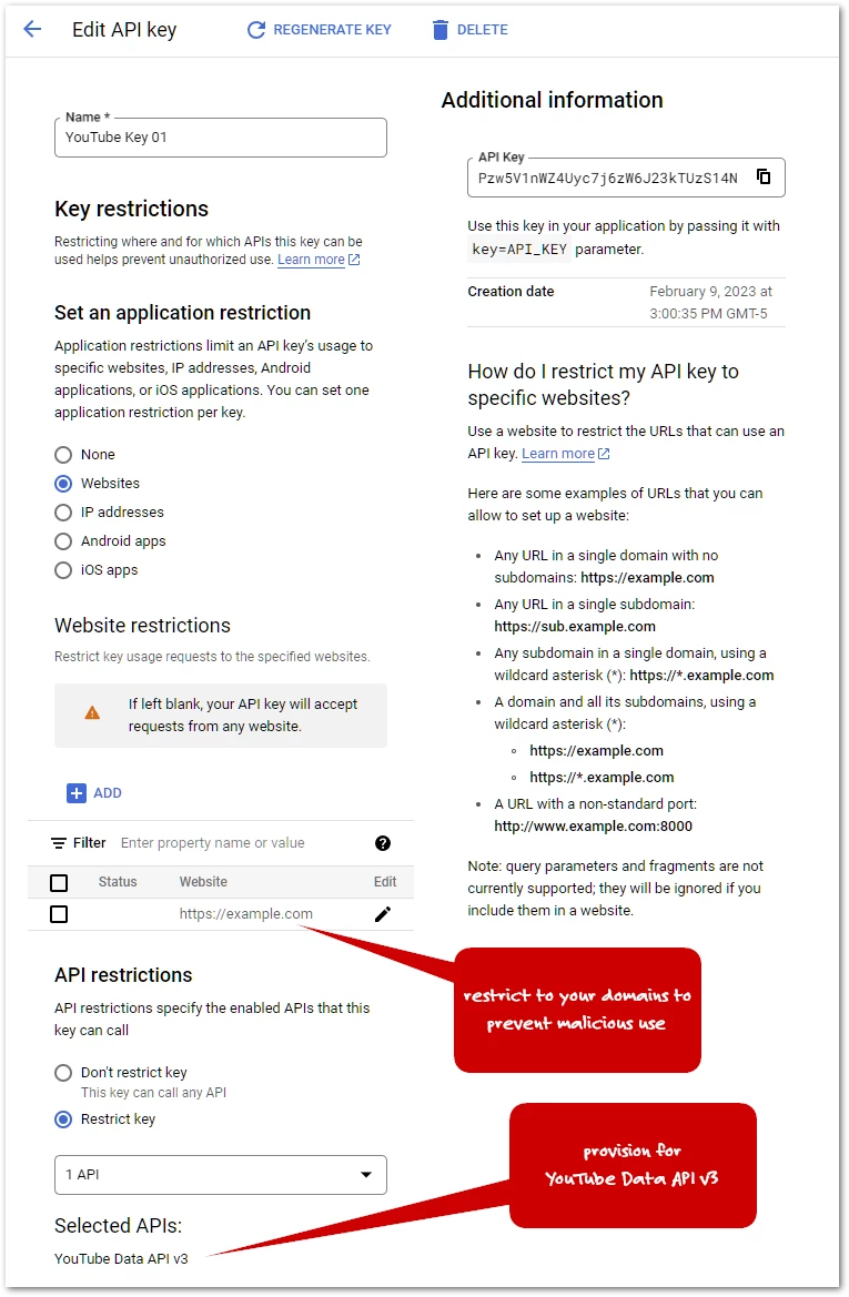 So provision an API key as below in the Developer Console. (This part may require help from whoever manages your Google account. If you’re using YouTube for business, you surely have such a person!)