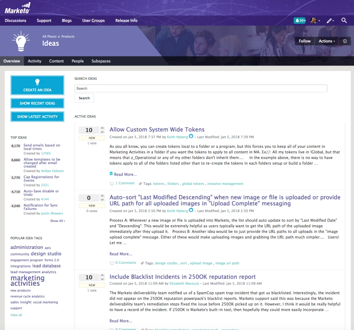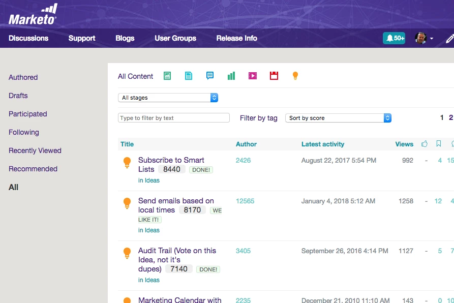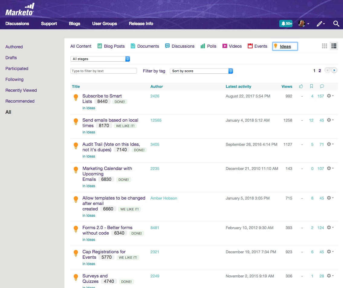 I participated in the pre-launch of this and one of my main suggestions was to give greater visibility to IDEAS.  As you can see, it's now under "Discussions", represented by a lightbulb icon.  Given that Ideas submitted by Marketo's customer base is what drives product innovation, is there a reason why it couldn't be added as a primary navigation item?  Also, I really miss the prior default page layout/format for Ideas: