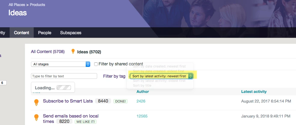 So I try to go to another view, hoping that I can select this sort filter from another screen.  I select "sort by latest activity: newest first":