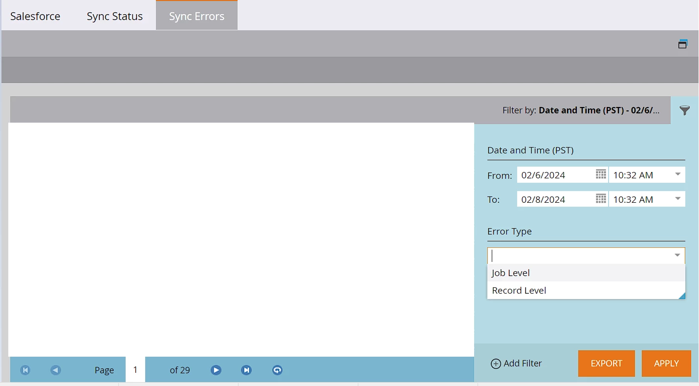 If you wish to add more filters (e.g., a filter on the object), you can go to the Sync Status tab next to the Sync Errors tab, select Status Type = Failed, and apply other filters to get and optionally export the list of all the corresponding SFDC sync logs.