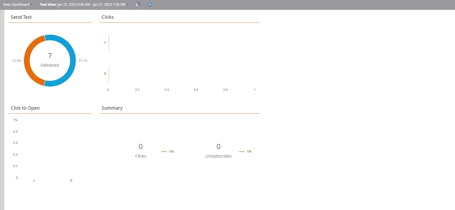 The winner has been declared as Email 1, however, the click rate for both the emails is 0 according to the AB test results dashboard.