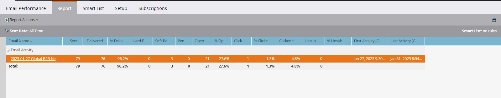 I tried to open the Email Performance report and see that the number of clicks for Email 1 is 1. PFA the images below.