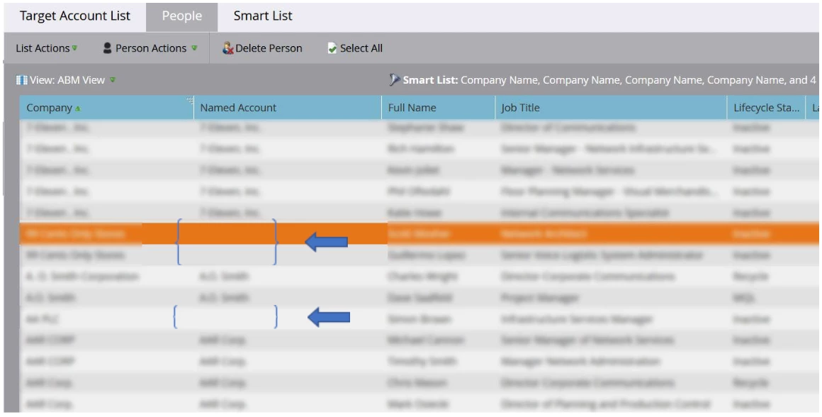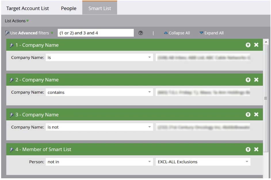 - Create a Smart List for your Target Account List. This list may take some time and focus to create, but it can be referenced in nearly all your campaigns, so it’s important that it is accurate. Be sure to include as many variables as possible to capture variations on the company name, but excludes similar names.