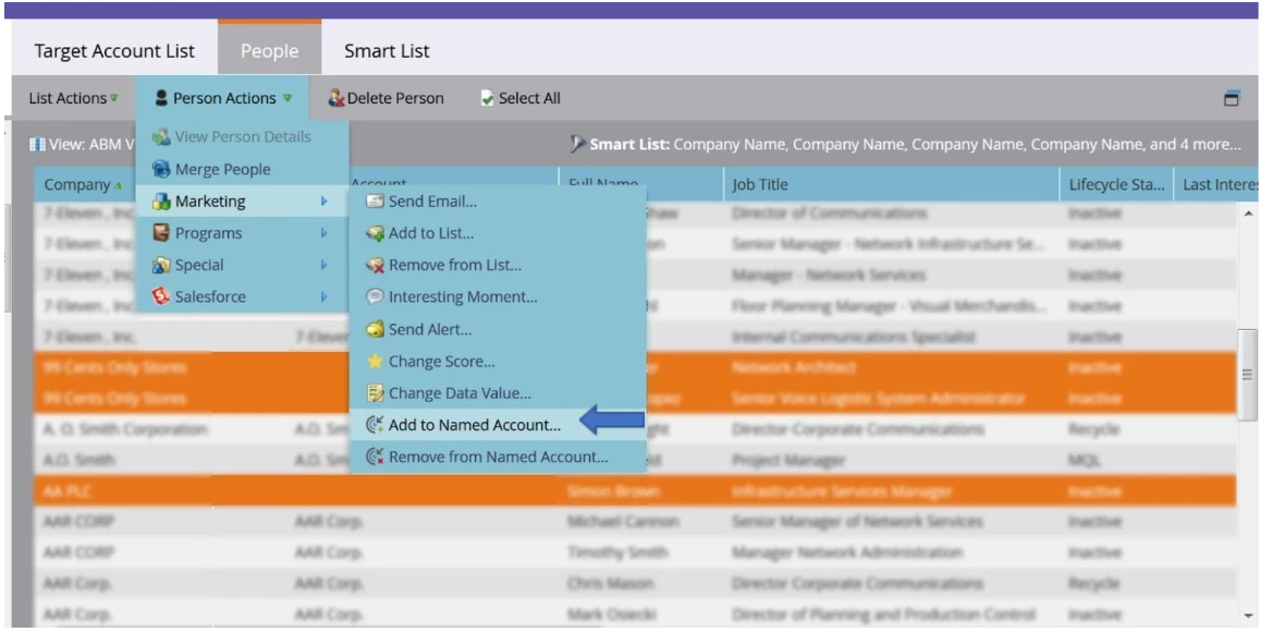 - Highlight the names, then under Person Actions, select Marketing, and choose Add to Named Account.